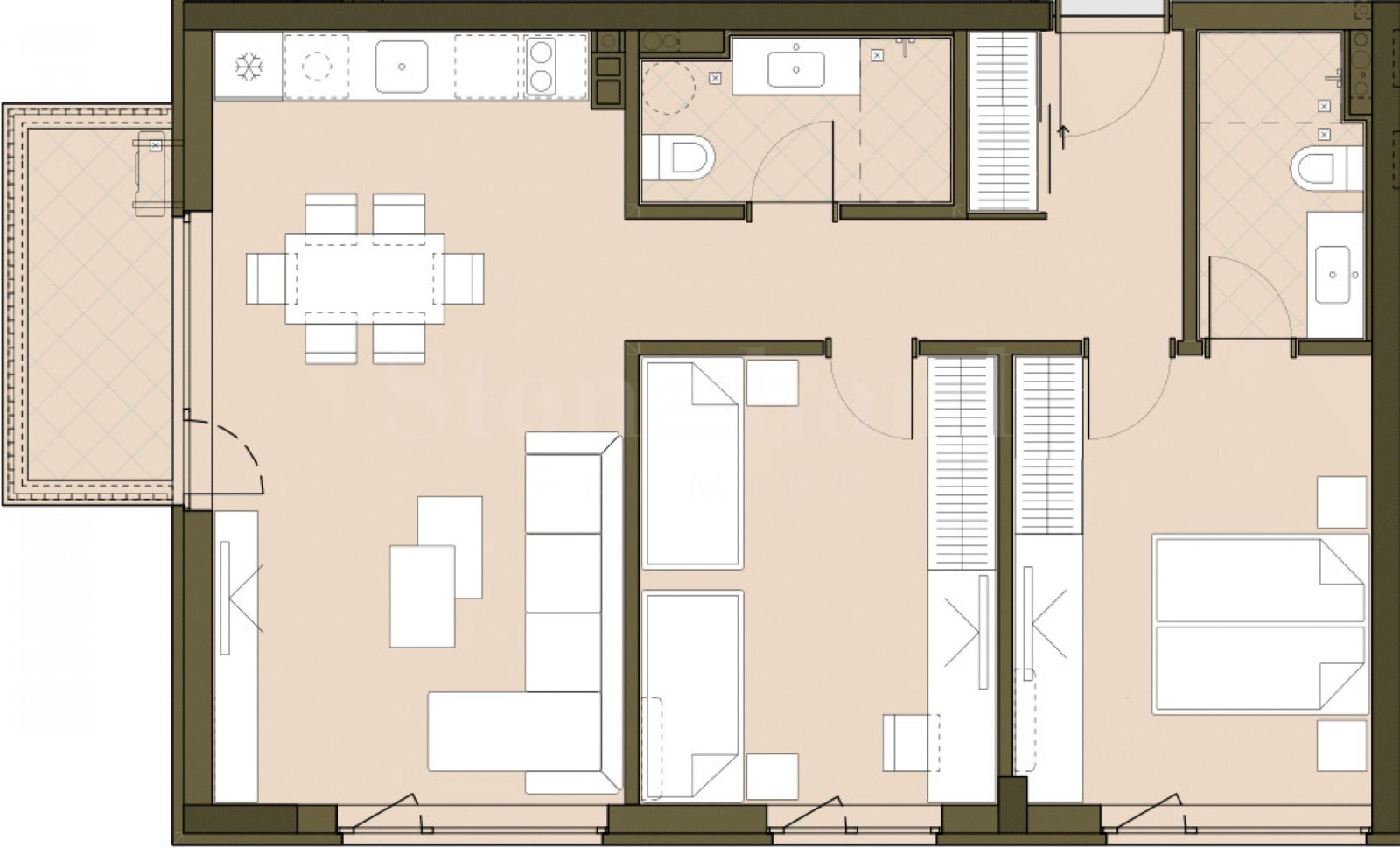 Имотът се намира на 5-и етаж и има обща площ 98.83 кв.м, застроена площ - 84.22 кв.м, с разпределение: антре, две бани с тоалетни, дневна с кухня и тераса, две спални. Издава се по БДС и е подходящ както за отлично ново семейно жилище, така и за инвестиция.