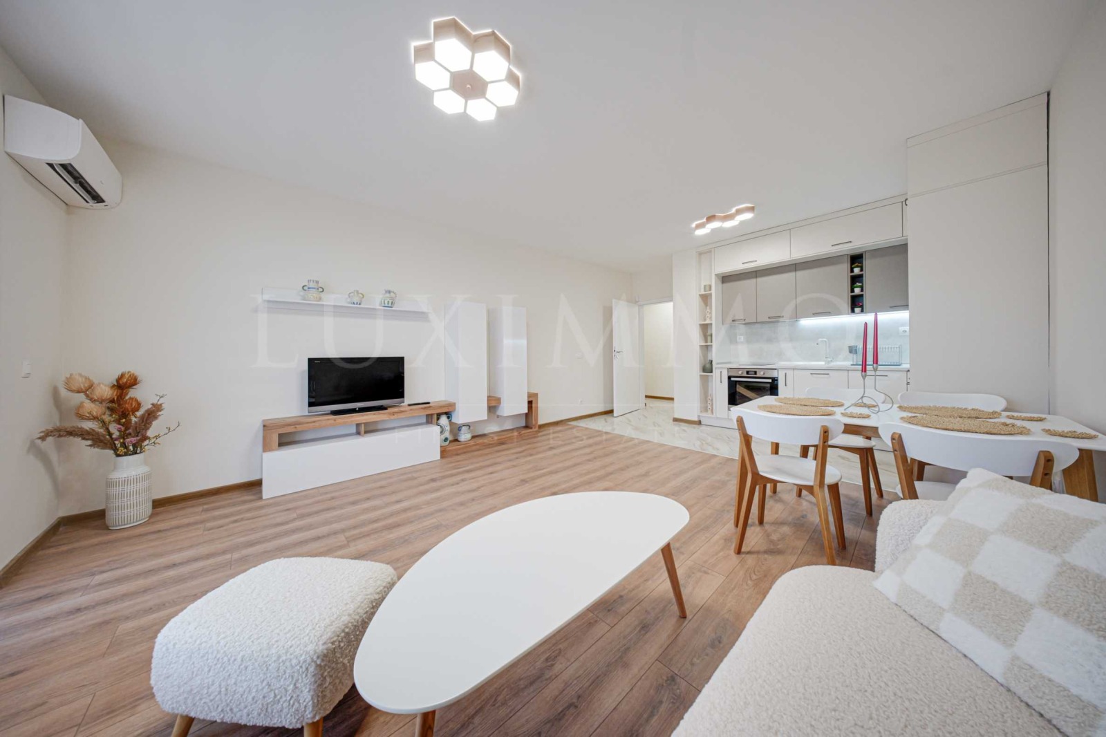 Обзаведен с модерни мебели и техника, имотът предлага светъл, първокласен и функционален интериор. Има всичко необходимо за живеене: хладилник, фурна, котлони, съдомиялна в кухнята, пералня в банята. Спалните са с легла, гардероби и нощни шкафчета, а в хола комфортен диван и телевизор.