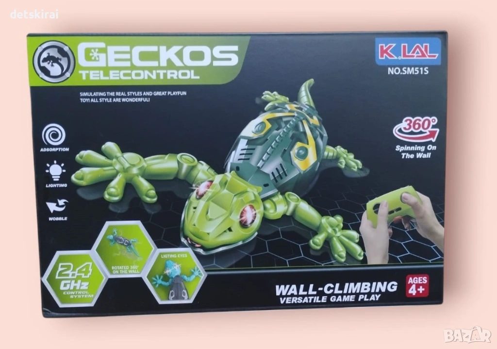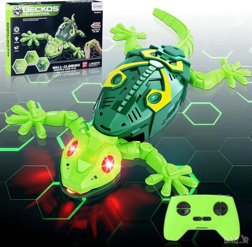Представяме ви интерактивния гущер Gecko с дистанционно управление – впечатляваща играчка, която може да се движи по пода, да се катери по стени, прозорци и дори по тавана. Благодарение на специалната технология за засмукване, геконът се движи стабилно по гладки повърхности и създава усещане за истинско животинче.