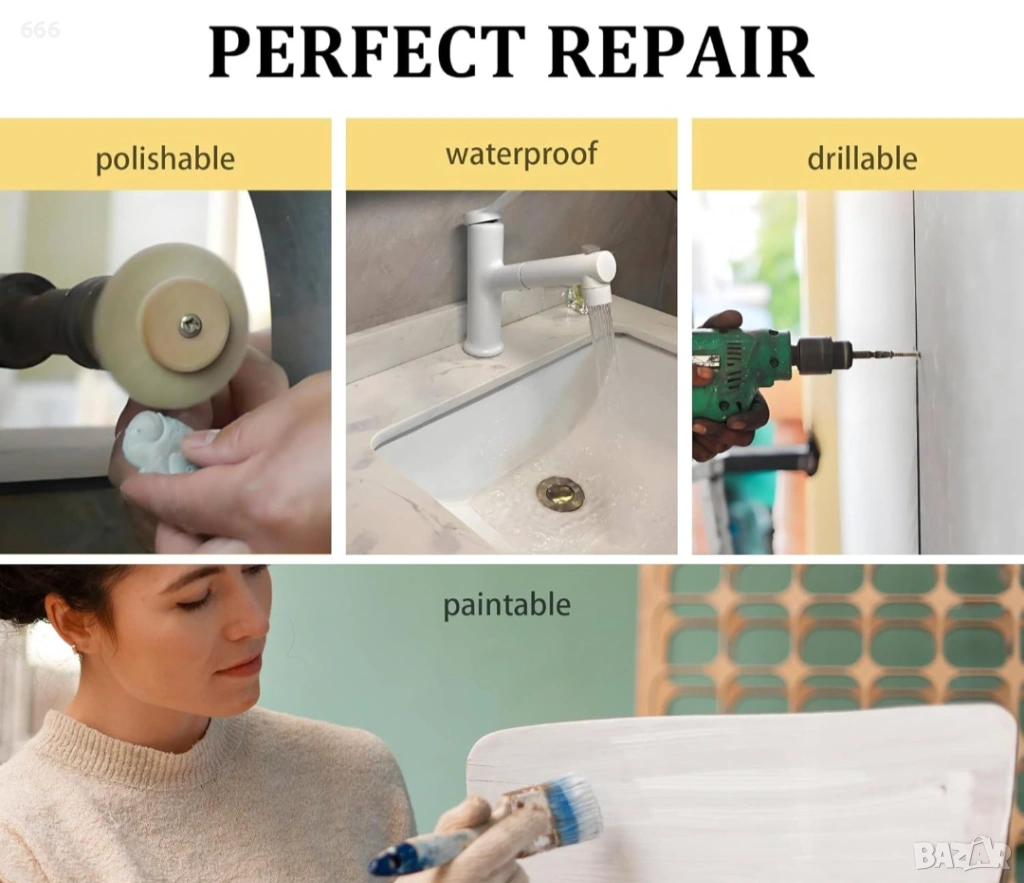 Безопасен за различни приложения: Този епоксиден пълнител за ремонт е нетоксичен и безопасен за употреба върху множество повърхности, което го прави идеален както за домакински ремонти, така и за творчески проекти. Неговата устойчивост на топлина от -50°C до 150°C осигурява гъвкавост в различни среди.