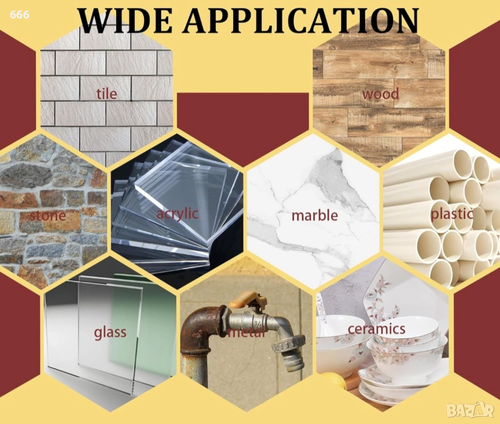 Съвместим с метал, дърво, керамика, пластмаса, стъкло и акрил.