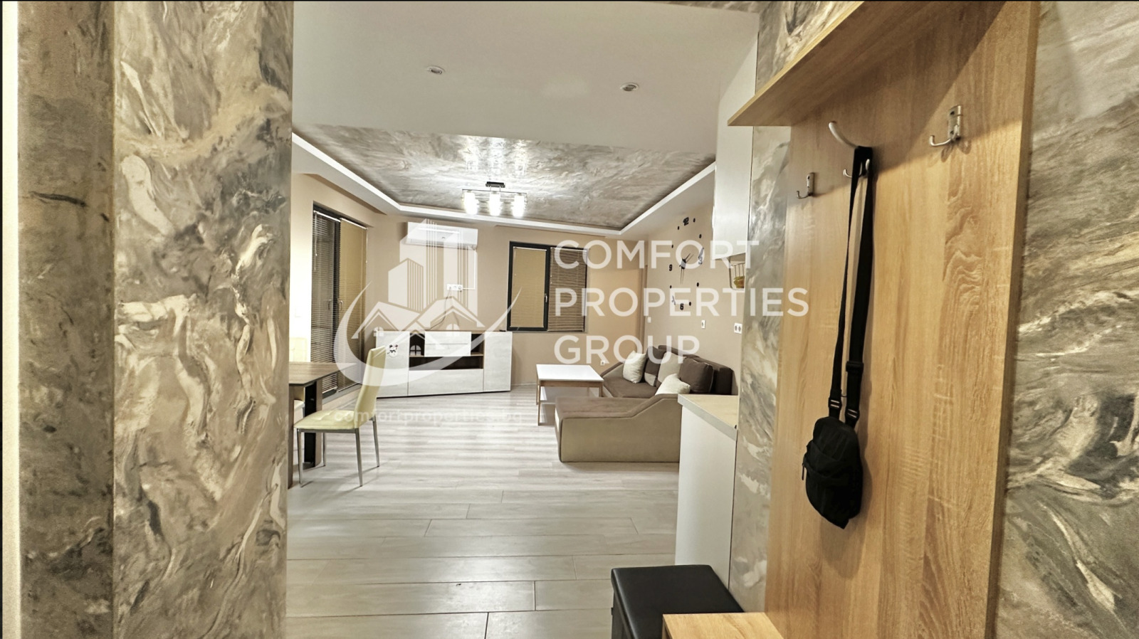 Всекидневна: маса за хранене с 4 стола, диван, кафе масичка, ТВ шкаф