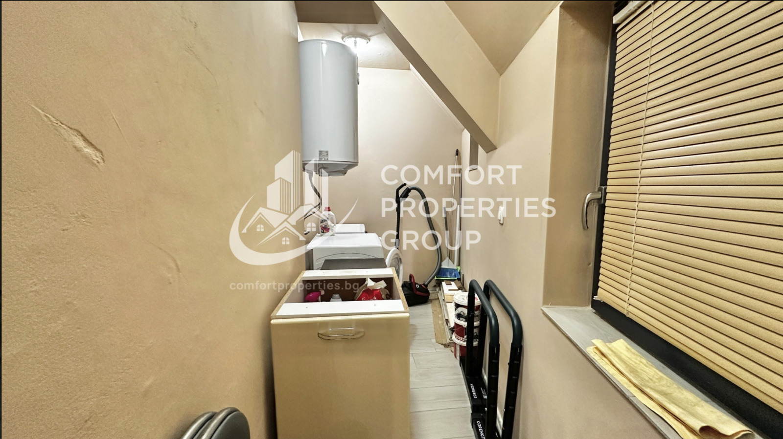Кухня: фурна с два котлона, хладилник, микровълнова, съдомиялна, пералня, сушилня, бойлер, климатик