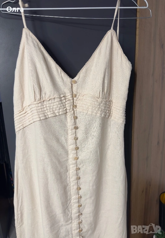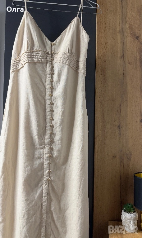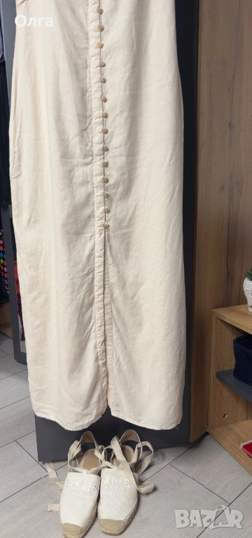 Продавам всичко от снимката: рокля и сандали. Давам всичко за 30€. Нови пантофи. Роклята е носена веднъж. ленена рокля