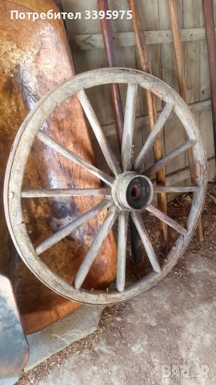 Две дървени колела за каруца: Истински артефакти от пътищата на миналото. С масивен джант, ковани елементи и перфектна геометрия на древните занаятчии, тези колела са мощен символ на движение и късмет и ще се превърнат в централен елемент във всяка градина, веранда или тематичен интериор.