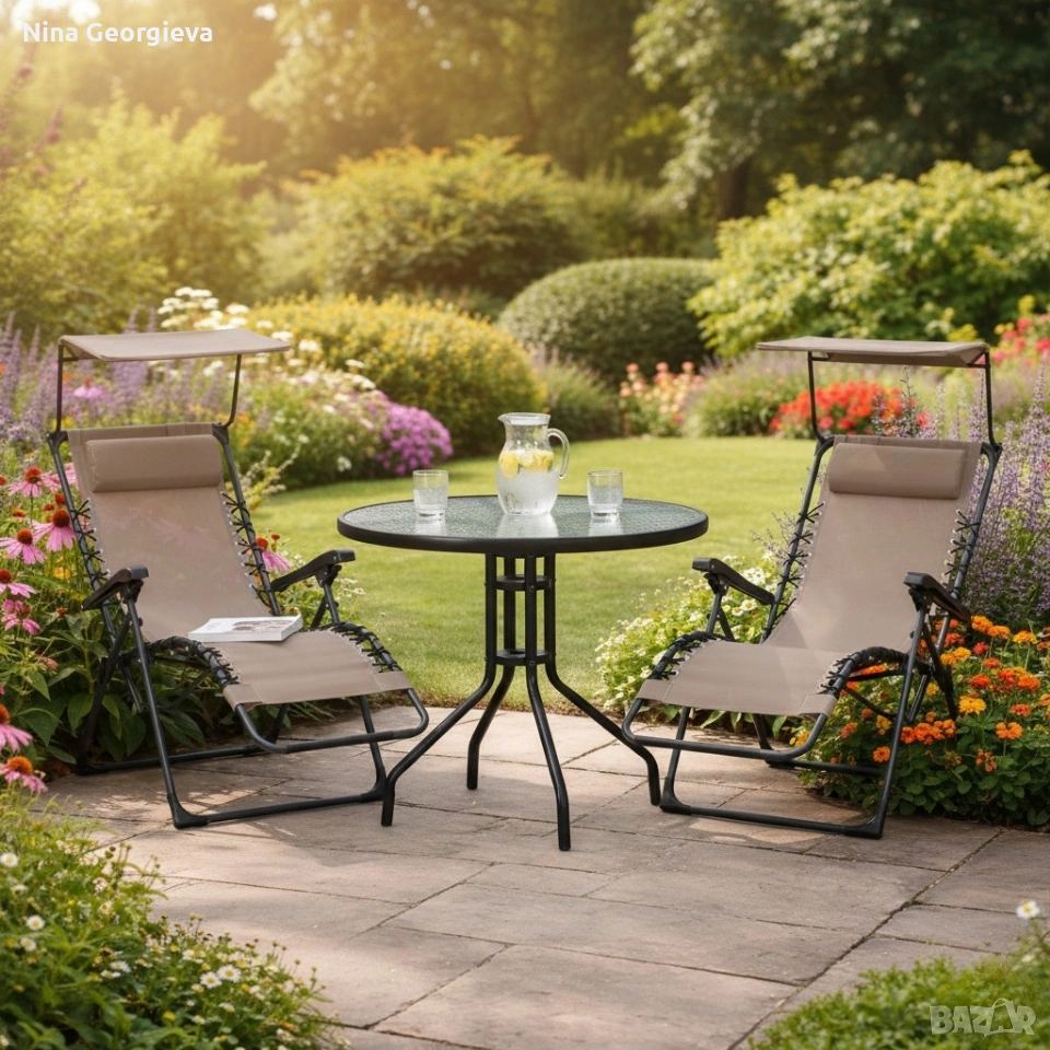 Комплект за релаксация на открито: 2 сгъваеми шезлонга с и стилна масичка за кафе