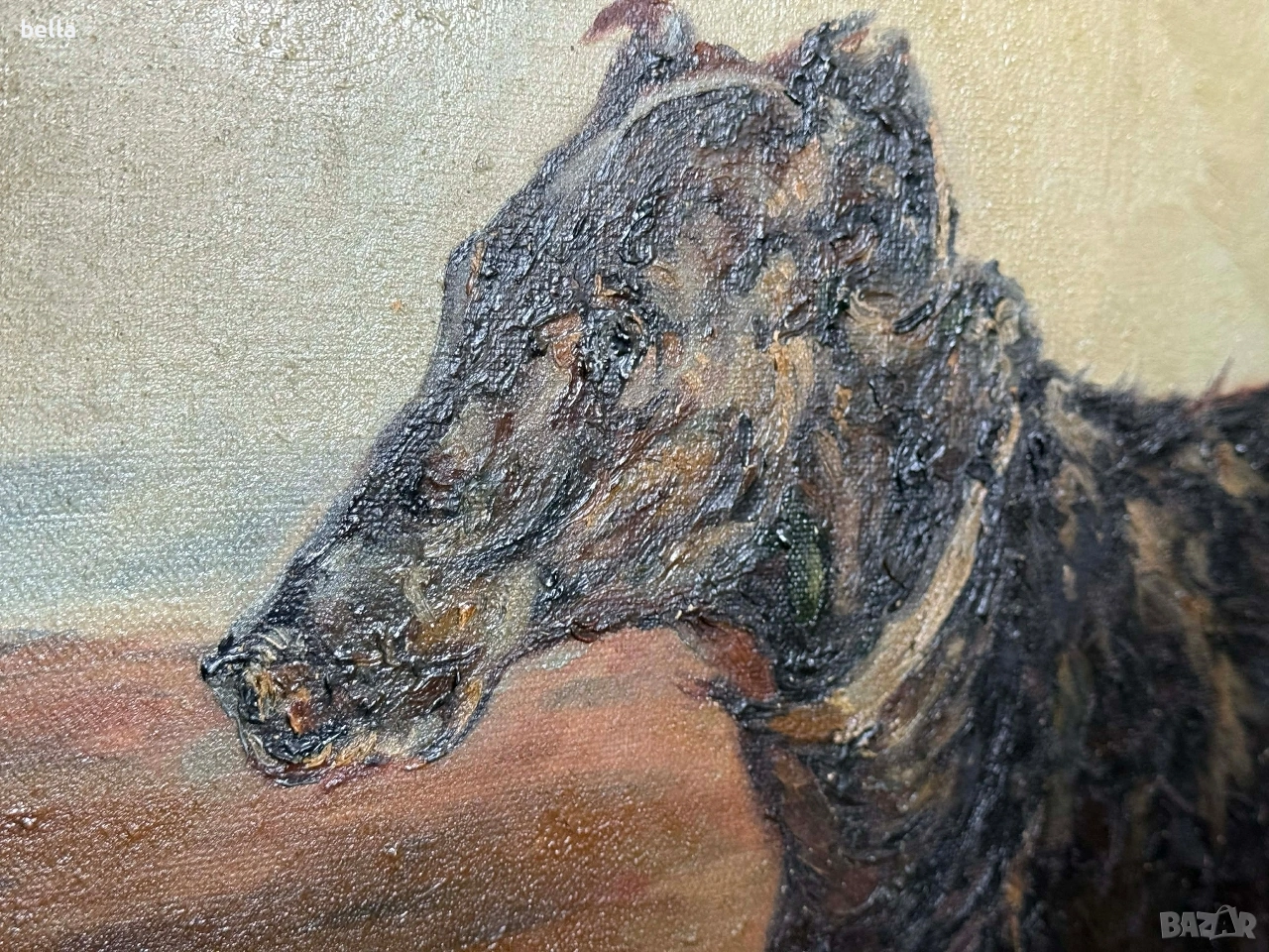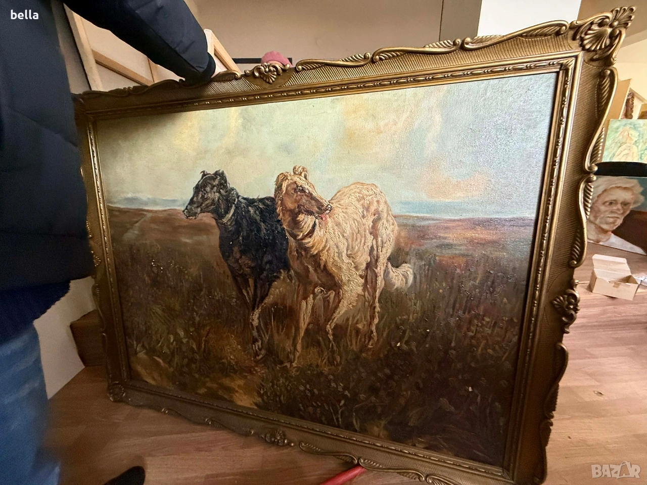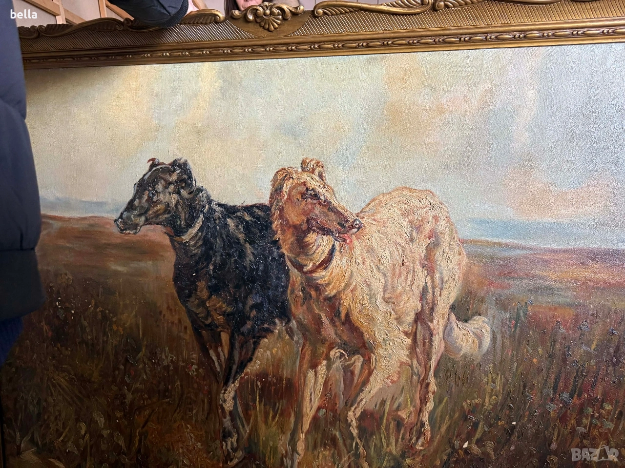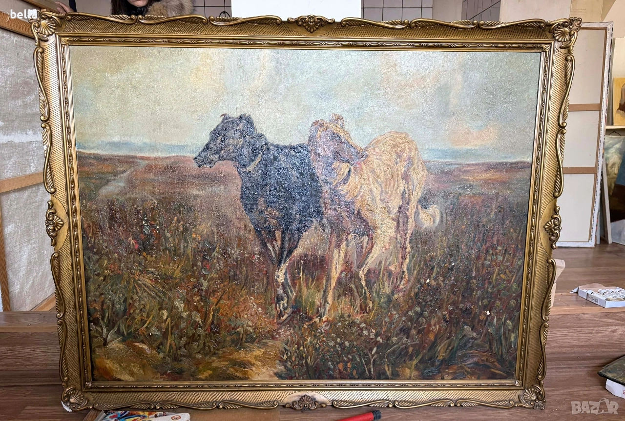 Старинно маслено платно "Руски борзои" – Музеен размер (140х110 см) Изключително мащабна и майсторски изпълнена маслена картина на платно, изобразяваща два руски борзоя в пълен устрем. Картината е с внушителни размери 140 см на 110 см, което я прави идеален акцент за голям салон, фоайе или кабинет в класически стил. ​Масло върху платно, богата пастозна мазка и прецизна анатомична детайлност. ​Композицията е идентична с шедьоврите на великия руски анималист Николай Сверчков (1817–1898). Макар да няма видим подпис, качеството на изпълнение и динамиката на фигурите предполагат авторство на високопоставен майстор от неговата школа или период. ​Картината е автентично стара, със специфичната патина на времето. Рамкирана е в масивна златна рамка с богата орнаментика, която е в отлично състояние. ​Размери: 140 х 110 см (заедно с рамката) .Цена 2500 евро