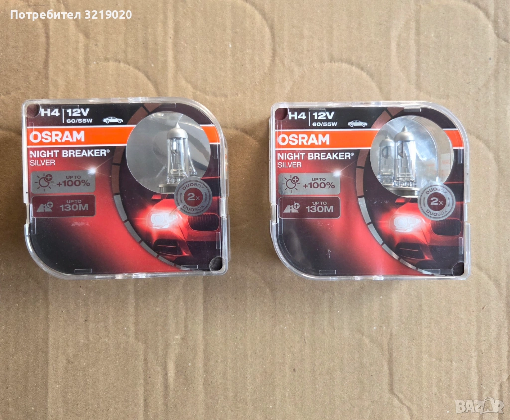 Чисто нови комплекти крушки за фарове OSRAM Night Breaker Silver +100% H4 в оригинални опаковки, неотпечатвани. Двойно по-мощна светлина в сравнение с обикновени крушки.