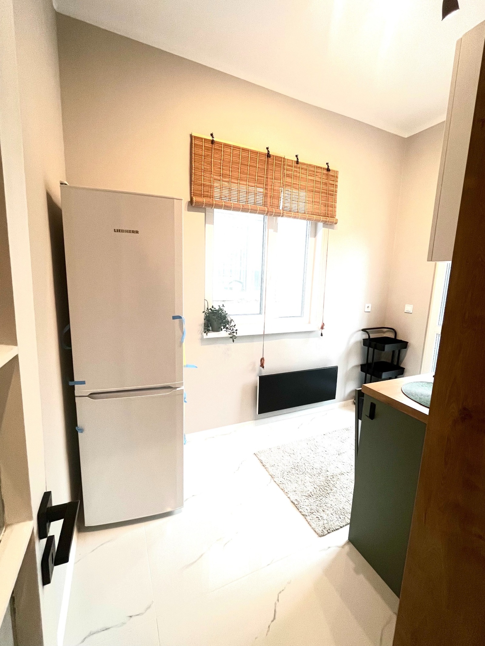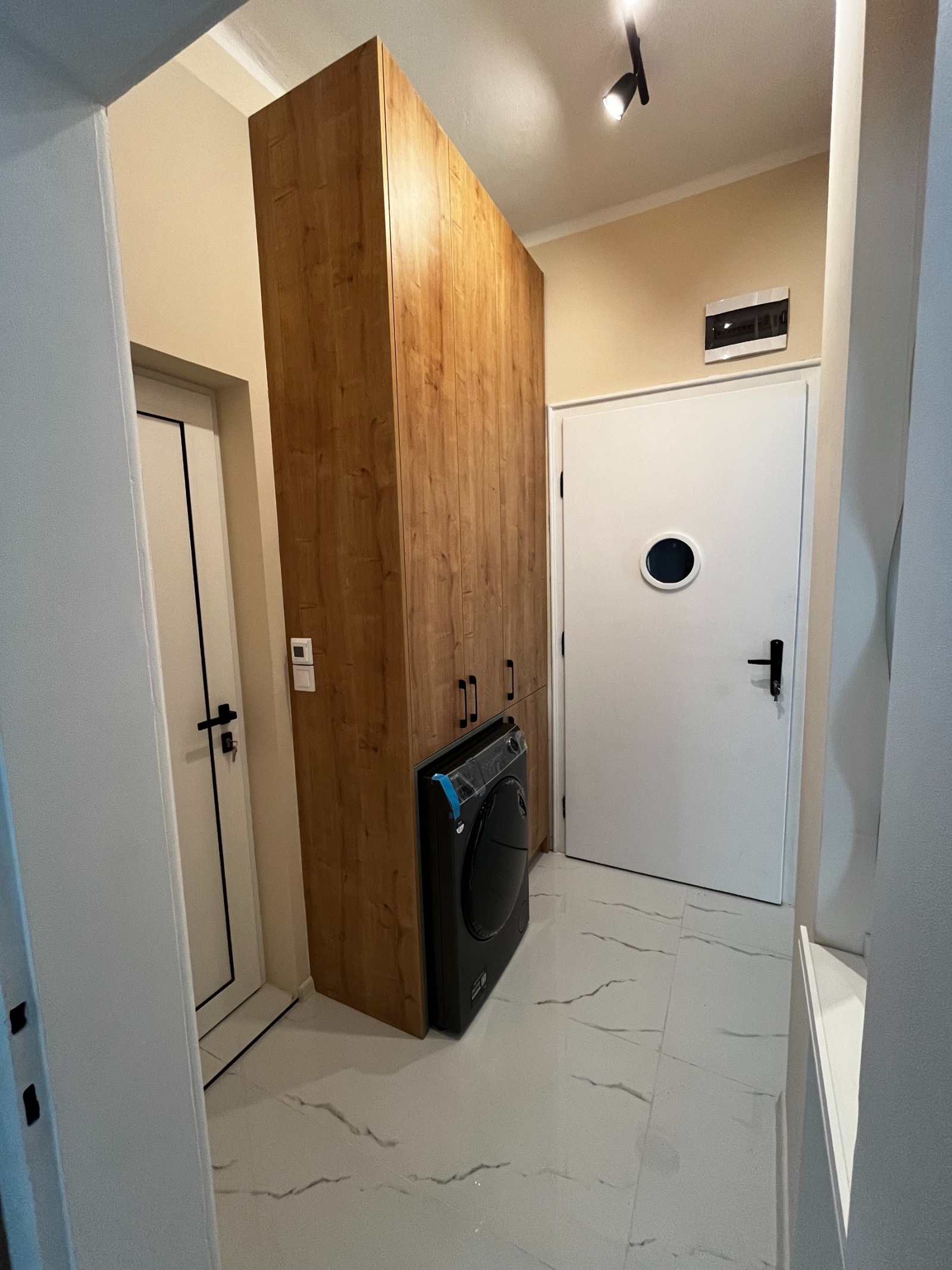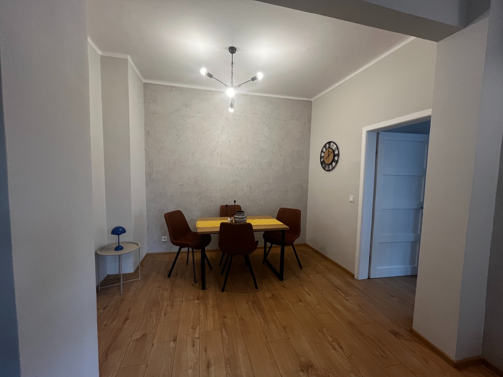 Разпределението включва просторна дневна с трапезарна част, отделна кухня, голяма спалня, модерна баня, функционално антре с вградени шкафове за съхранение и тераса.