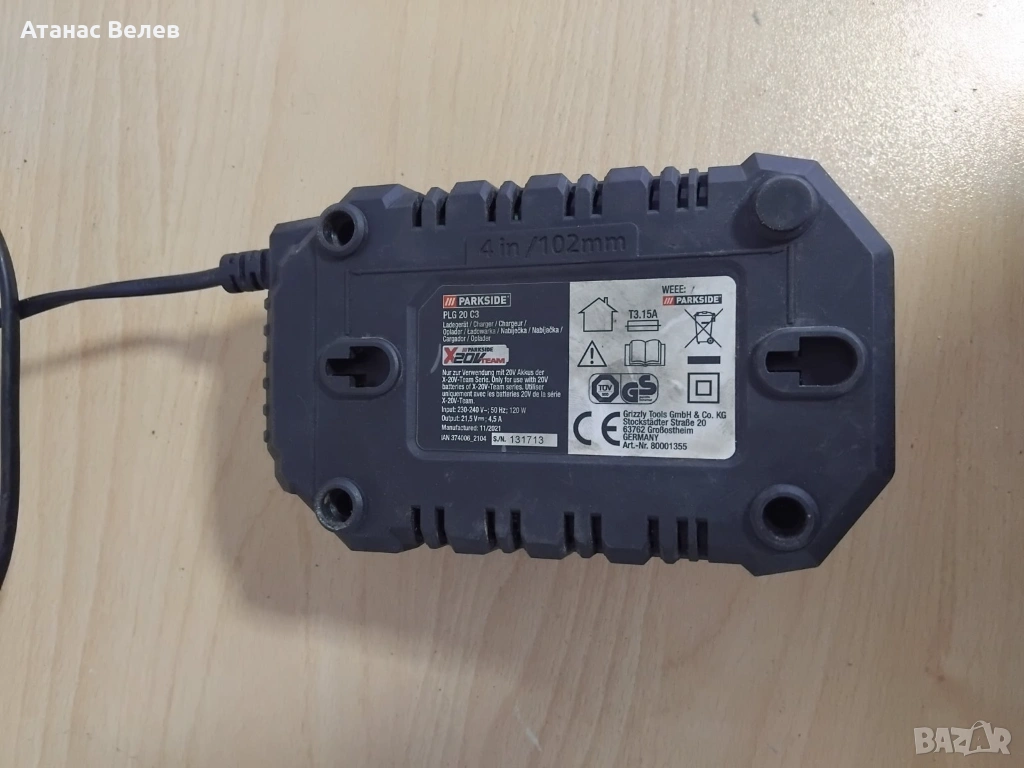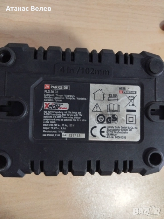 1 брой оригинално зарядно Parkside PLG 20 C3 (4.5Аmax) активно охлаждане с вентилатор