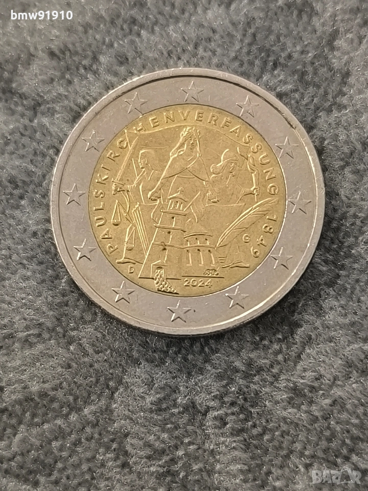 Германска възпоменателна монета от 2 евро, посветена на „Паулскирхе“ (Paulskirche) във Франкфурт. Дизайн: Изобразява църквата „Св. Павел“ (Paulskirche) с надпис „PAULSKIRCHE“ (Паулскирхе) и годината на издаване.