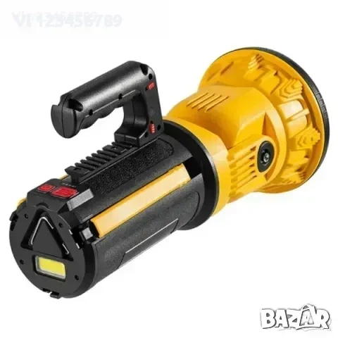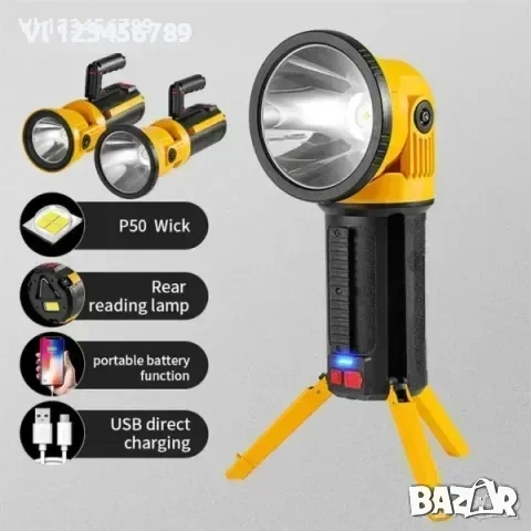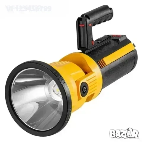 Мощен мултифункционален прожектор, водоустойчив с акумулаторна батерия. Прожектора е с иновативен дизайн, който разширява възможностите му за използване. Има дръжка за носене, която може да се мести. Има три крачета, кука отзад за закачане, шарнирна въртяща се на 180° светеща глава, светлинен индикатор за заряда на батерията.