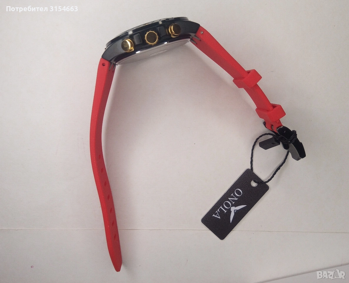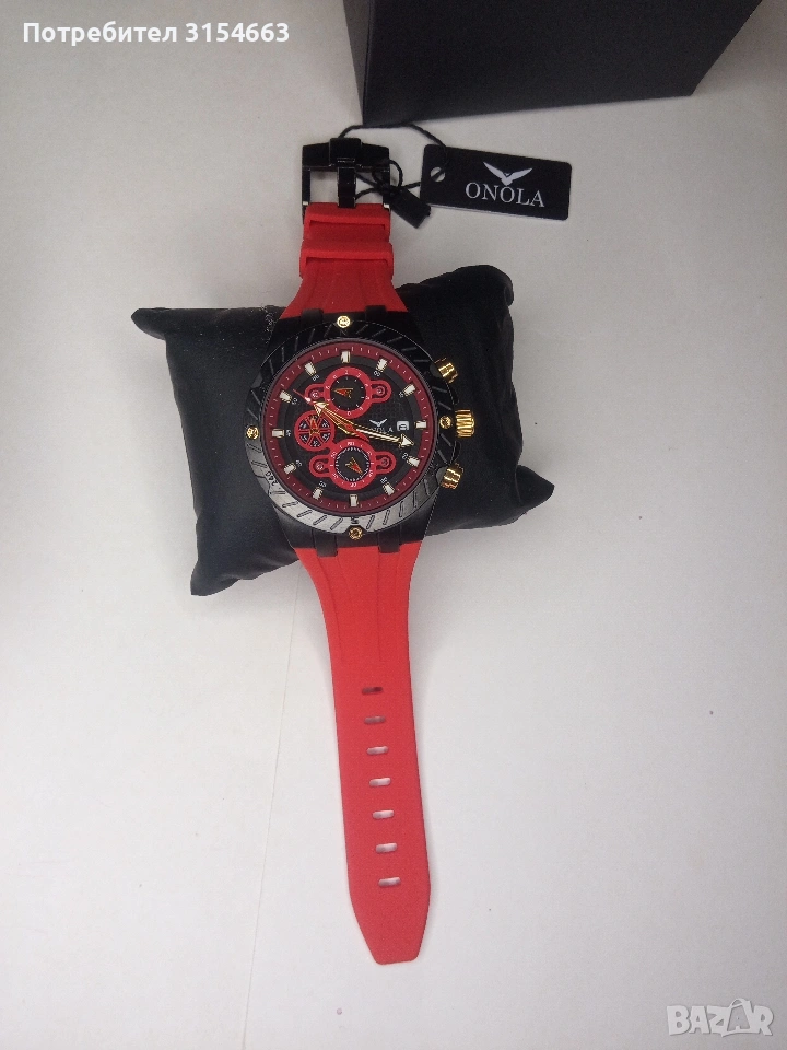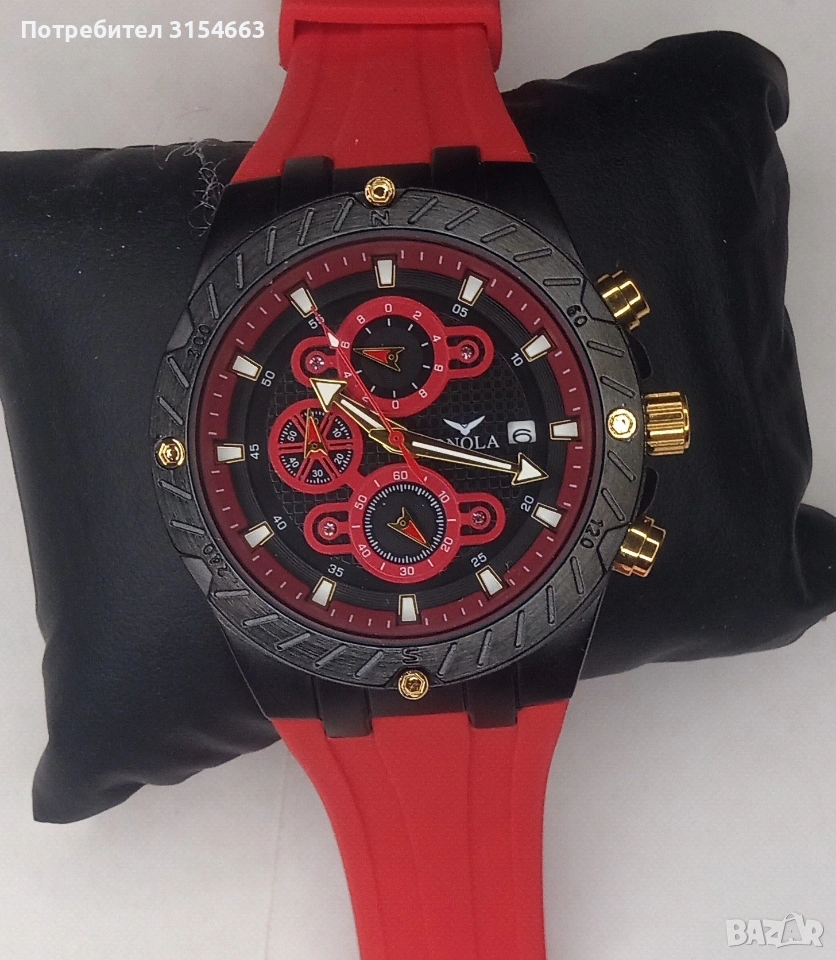 Луксозен мъжки часовник - кварцов, водоустойчив, функция календар, светещи стрелки, силиконова каишка, закопчалка тип катарама. Диаметър на циферблата 4,4 см. Дебелина на корпуса 1 см. Лентата е с дължина 24 см и ширина 2 см.