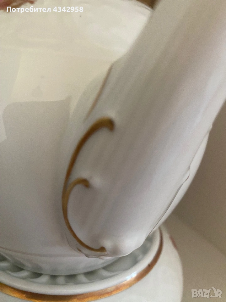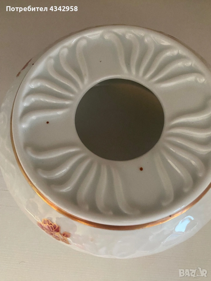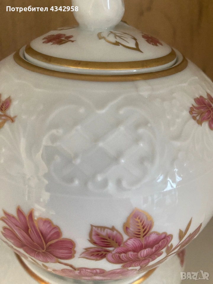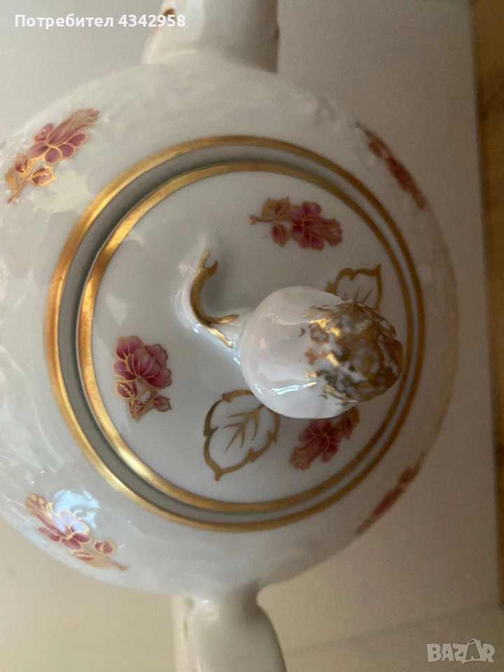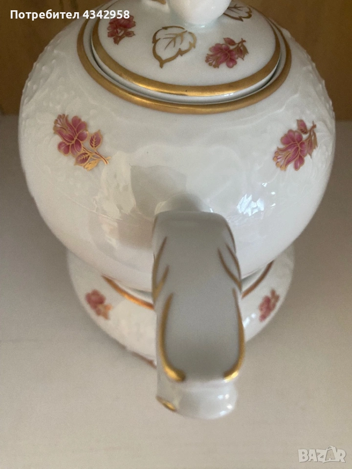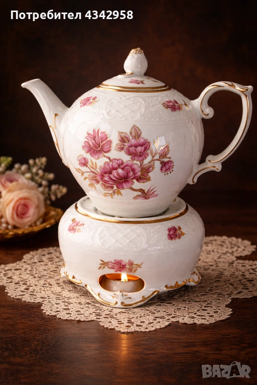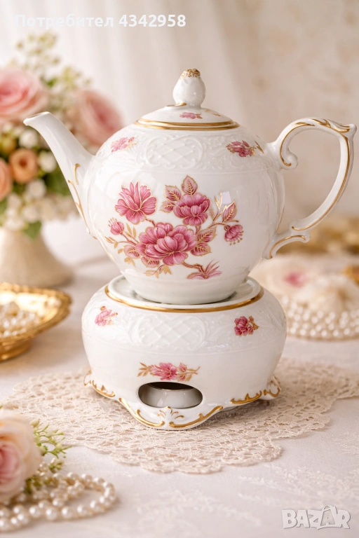 Фин бял порцелан с красив релефен орнамент, декориран с нежни розови цветя и златен кант. Чайникът се поставя върху специална порцеланова основа със свещ, която поддържа чая топъл – практично и много красиво решение за сервиране.