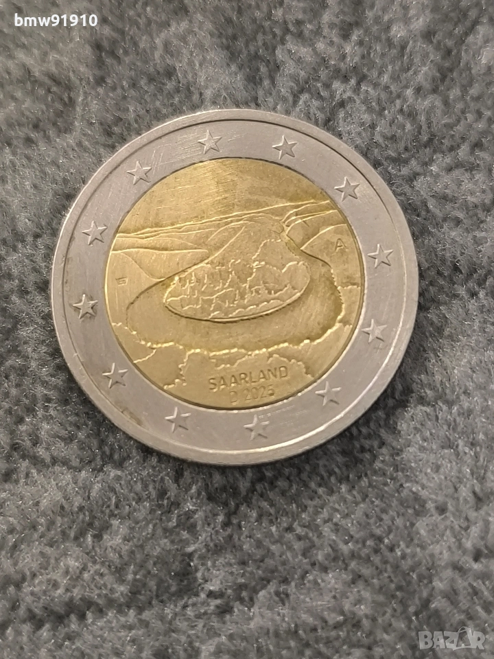 Тази монета е германска възпоменателна монета от 2 евро, посветена на федералната провинция Саарланд. Дизайн: Изобразява живописната извивка на река Саар, известна като „Сааршлафе“ (Saarschleife).