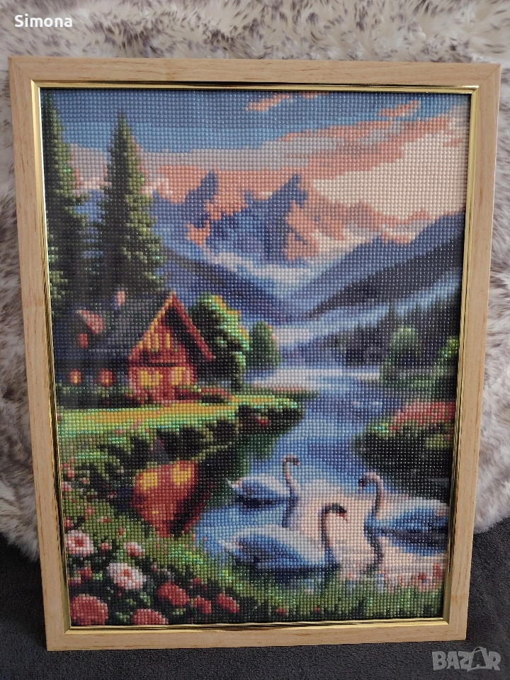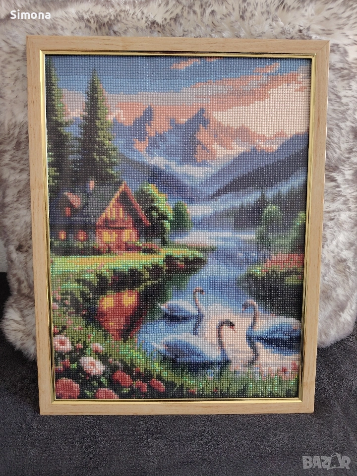 Ръчно изработен диамантен гоблен в рамка - изобразяващ уютен дом сред природа, цветя и лебеди Размер:45х35 см