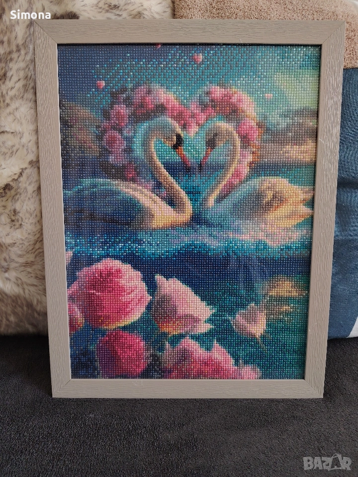 Ръчно изработен диамантен гоблен в рамка- изобразяващ два лебеда, оформящи сърце сред розови цветя. Размер:45х35 см
