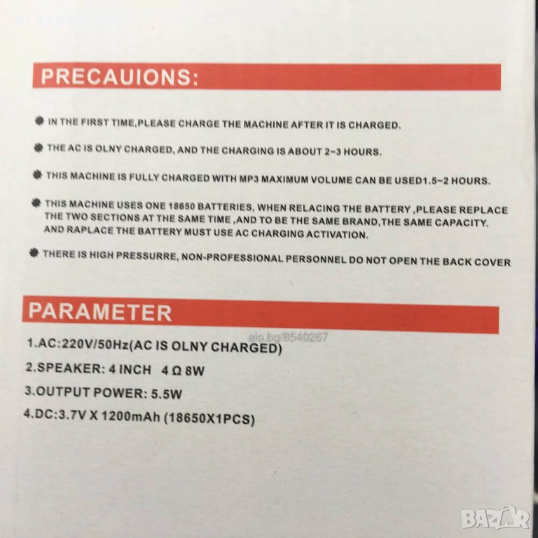 Възпроизвежда записи от TF/USB в MP3 формат, има блутут с обхват 10 м.