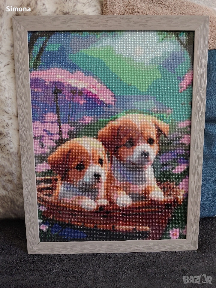 Ръчно изработен диамантен гоблен в рамка - изобразяващ сладки кученца в кошничка