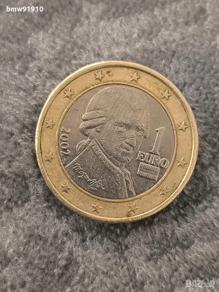 Това е австрийска монета от 1 евро, емитирана през 2002 година. Дизайн: Изобразява портрет на известния австрийски композитор Волфганг Амадеус Моцарт.