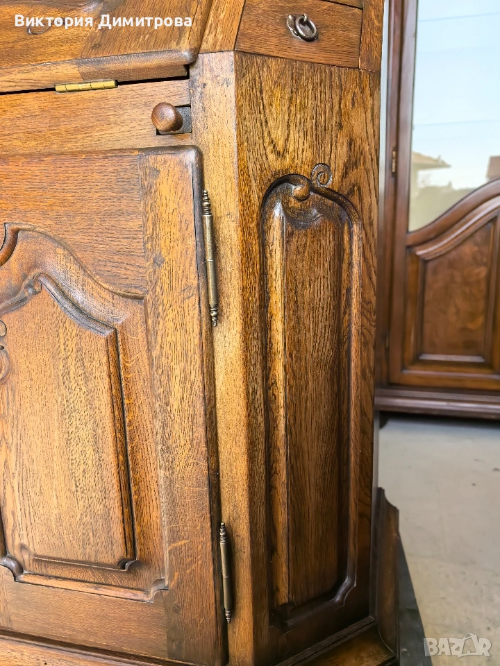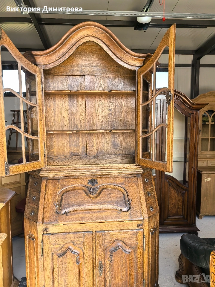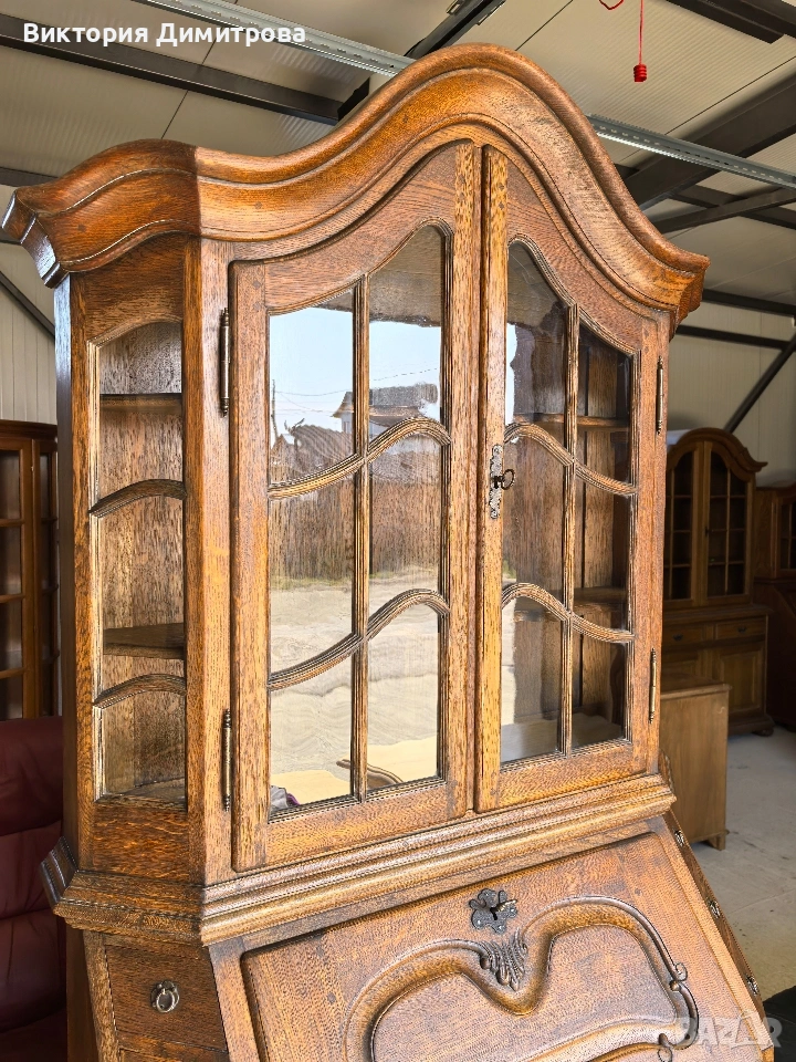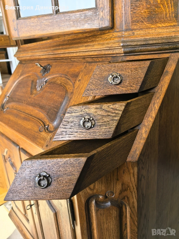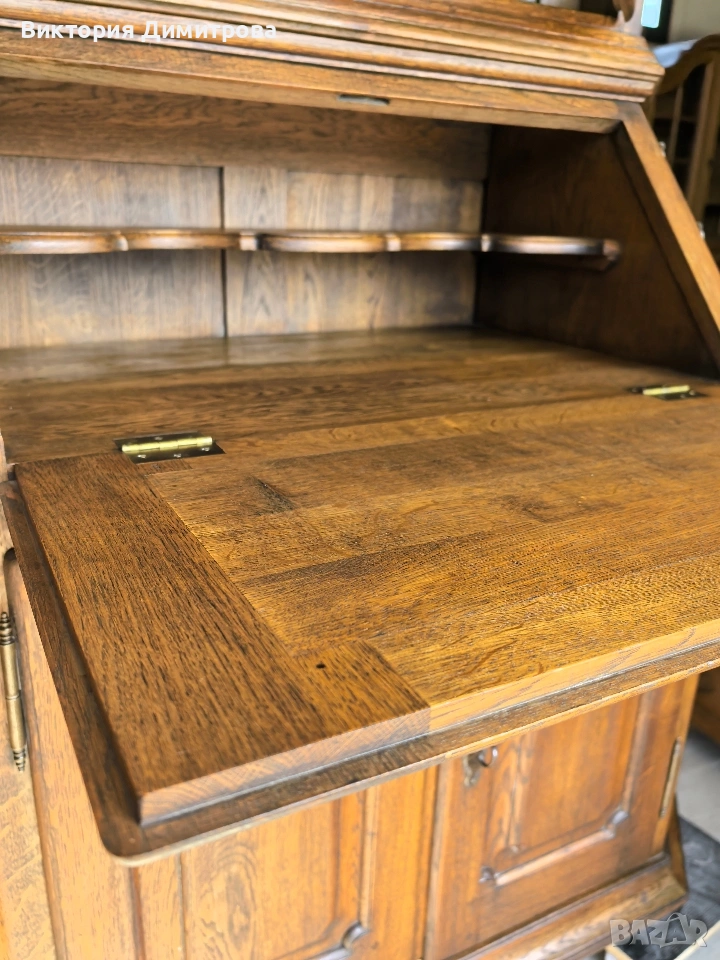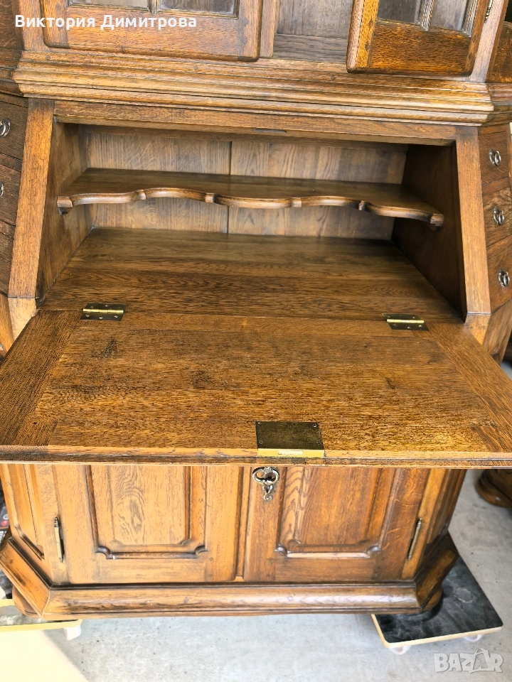 Античен Секретар с витрина / Писалище с надстройка ✨️ Рустикален Стил ✨️ МАСИВ дъб (Eiche Vollholz) ✨️ Производител: FORM Exclusiv (FORM exclusiv-werkstätten), W. Germany ✨️ Прогнозен период: кр. на 60-те години ✨️ Два модула ✨️ Оригинални старинни ключалки и ключ ✨️ Витрина (надстройка) със стъклени врати ✨ Секретар (Писалище) с падащ борд, осигуряващ работна зона ✨️ Шкаф с две врати за съхранение ✨️ Странични чекмеджета - 6 бр. 📚 при поръчка: код 01-122 ⚜️⚜️⚜️ Цена: 499.00 € ⚜️⚜️⚜️ Размери: Широчина: 108 см. Дълбочина: 50 см. Дълбочина с писалищната зона: 82 см. Височина: 218 см. Височина на писалищната зона: 75 см. ⚜️⚜️⚜️ Втора употреба! Състояние: В много добро ретро състояние! 👉Възможни са следи от употреба и/или износване. Внос Германия! 🇩🇪🇩🇪🇩🇪