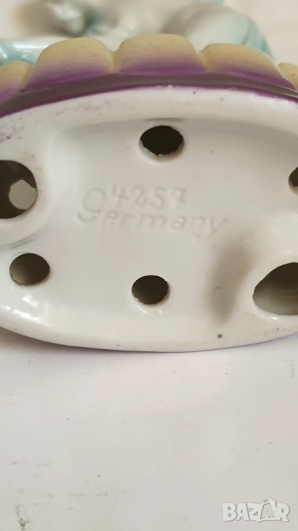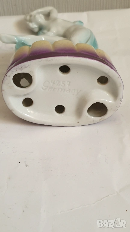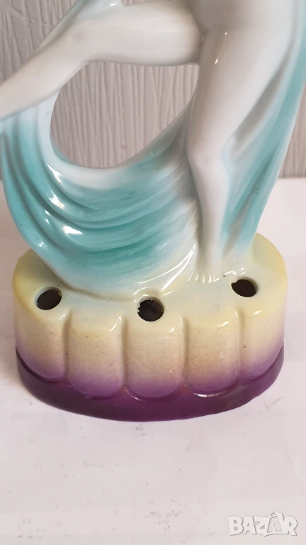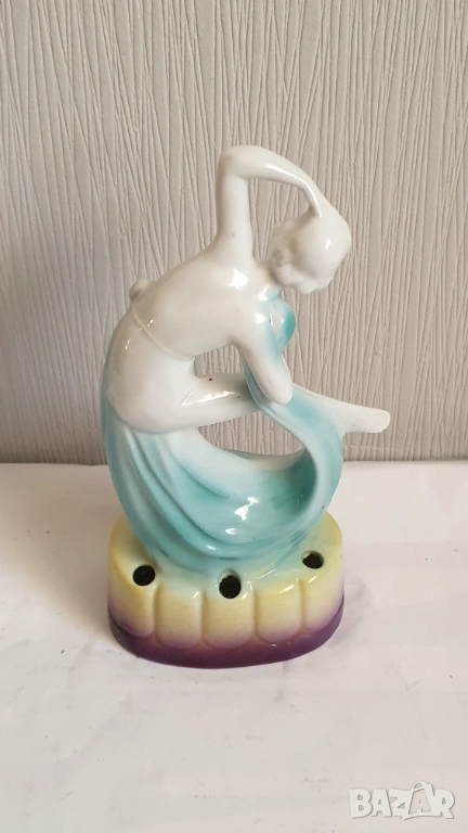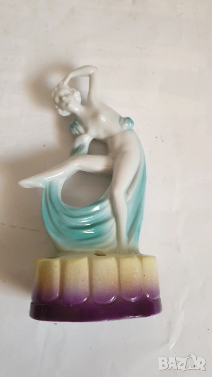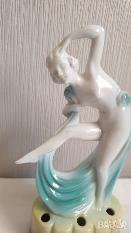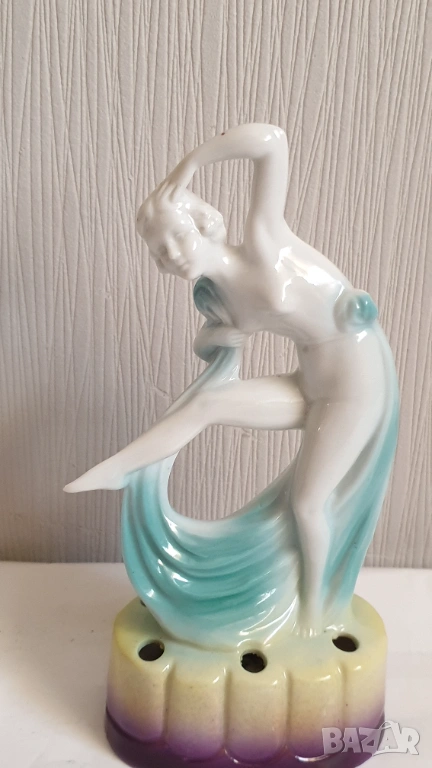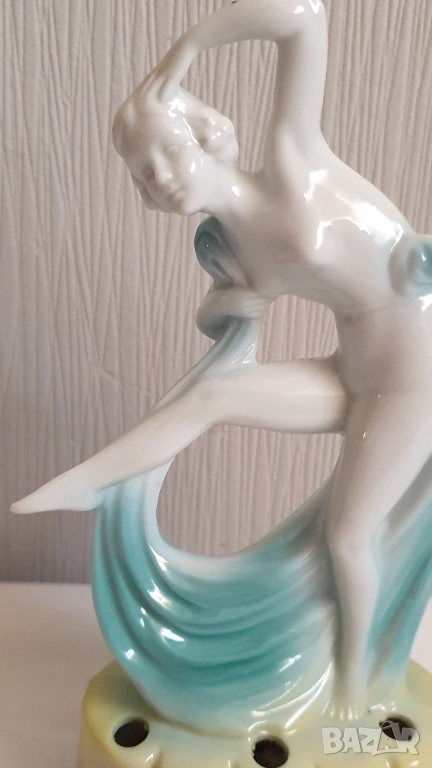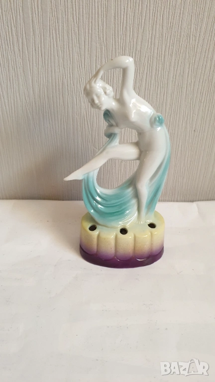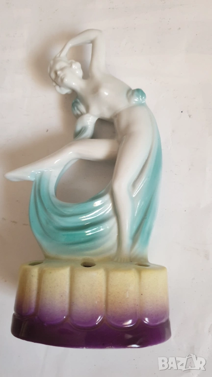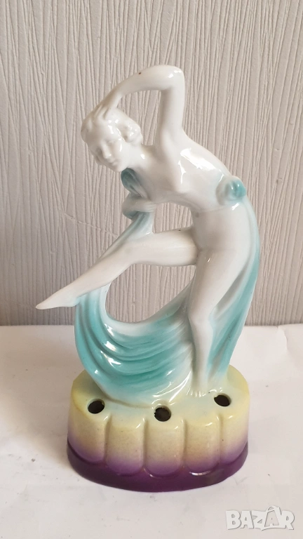 Танцуваща дама с воал Фигурка на цвете жаба Арт Нуво Около 1920 г. Порцеланова гола нимфа, цвете жаба, вдъхновена от Арт Нуво, ГерманияТози вид цветна жаба обикновено се е намирал в центъра на конзолна купа, която е била доста популярна през тази епоха. Формата на цветната жаба има както влияние на арт нуво, така и на арт деко. Докато повечето са били изработени от бял порцелан с силно глазирано покритие, белият порцелан на тази красавица на цветен фон от флорален гирлянд и панелна ваза е нетипичен и доста красив.В отлично състояние с минимално износване, подходящо за възрастта. Има едно миниатюрно петънце в горната част на дясният крак и на лявата ръка в резултат на производствения процес (моля, разгледайте всички снимки), което не влияе на красотата или полезността му. Това не е необичайно при по-стария порцелан и се дължи на железни частици в глината, използвана за направата на порцелана. По-старата глина е имала малки количества железни остатъци в сместа. След дълги периоди от време желязото си проправя път към повърхността и се вижда черно петънце. Казват, че всъщност са кафяви, защото е окислено желязо или ръжда. Изглеждат черни, защото са толкова малки. Произведена е в Германия и ще видите това от долната страна, заедно с номер, но без действителен печат на производителя. За колекционери.