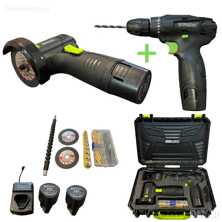 Комплект акумулаторен ударен винтоверт + мини ъглошлайф STAHLMAYER 24V – мощност и свобода без кабели