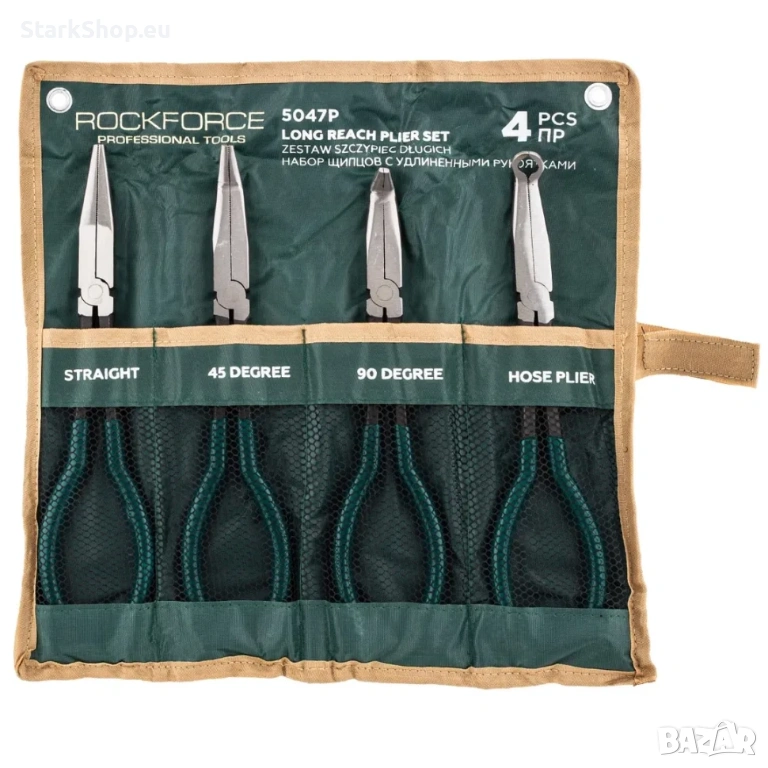 Професионален комплект дългорамeнни клещи Rock Force - 4 части CR-V, предназначен за работа в тесни, дълбоки и трудно достъпни пространства. Изработени от висококачествена хром-ванадиева стомана (CR-V), клещите осигуряват висока здравина, дълъг експлоатационен живот и надеждност при професионална употреба.