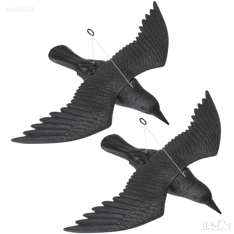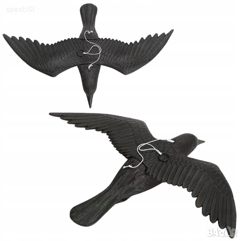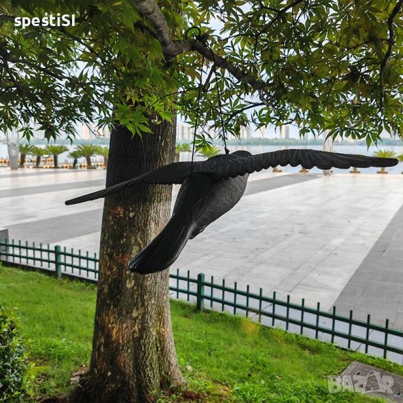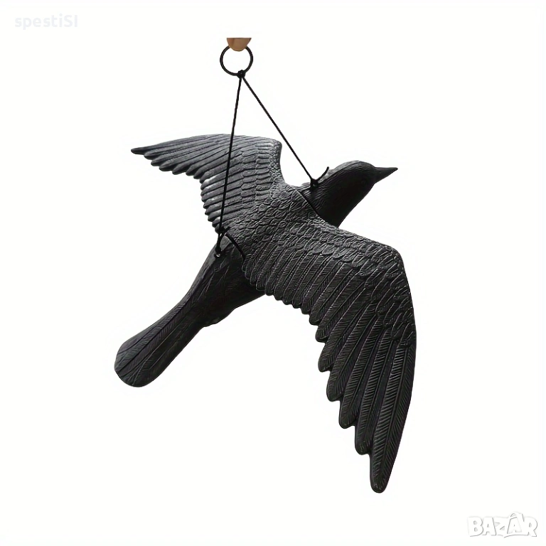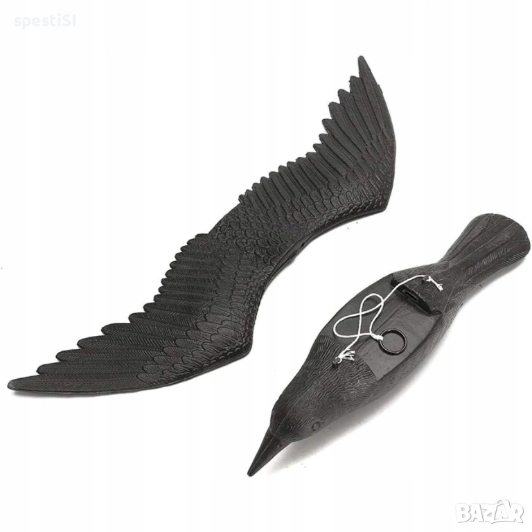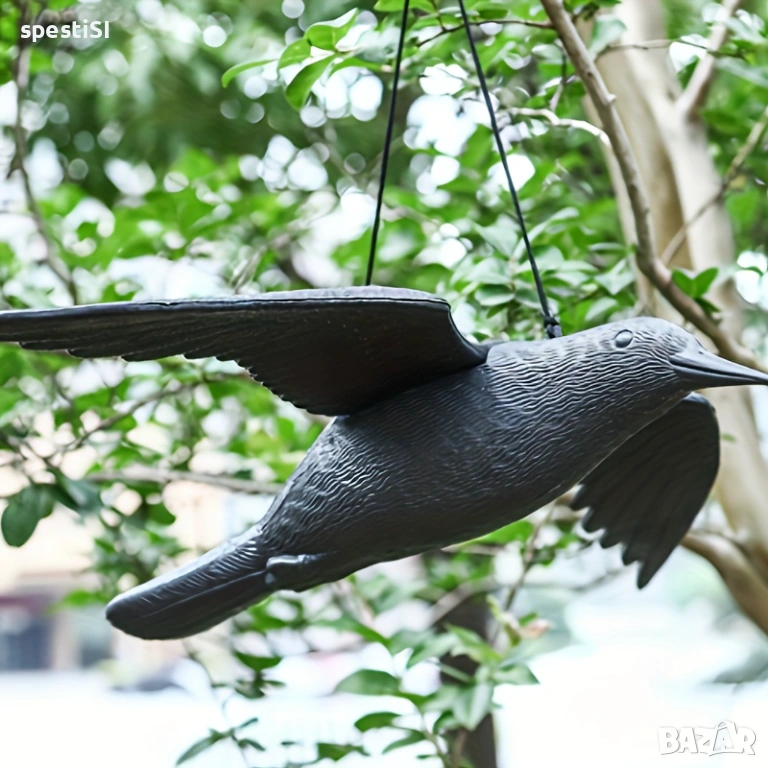 Монтажът е изключително бърз – крилата се прикрепят към основното тяло, след което изкуственият гарван се закача на подходящо място под навеса на терасата или на клон в градината.