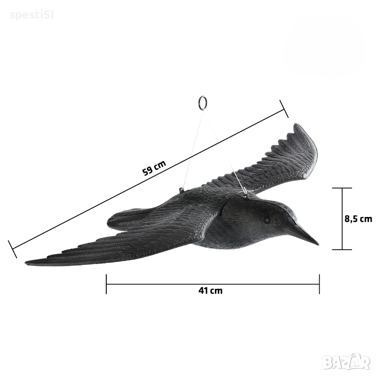 Изработен е от издръжлива пластмаса, която е устойчива на слънце и дъжд, което го прави подходящ за целогодишна употреба на открито. Моделът имитира птица в полет и е снабден с въже и метален ринг за лесно окачване. При наличие на вятър, макетът се люлее, което подсилва реалистичния му вид и повишава ефективността му като плашило за птици.