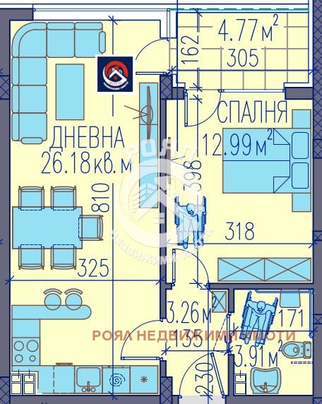 Жилището се състои от дневна с трапезария и кухненски кът - 26 м2, една спалня - 13 м2, тераса с излаз от двете стаи - 5 м2, баня с тоалетна и входно антре.