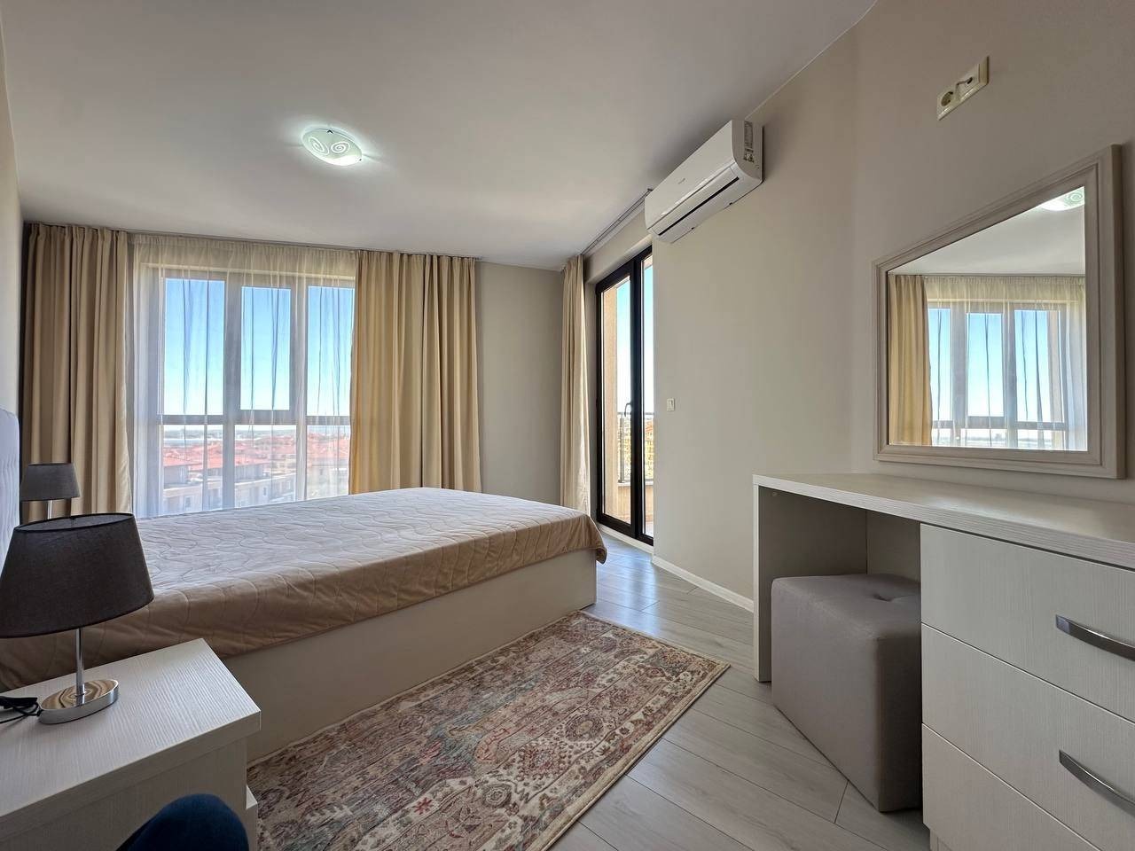 Ексклузивен вариант на морския бряг от Болгарский Дом! Този тристаен апартамент се гордее с панорамна гледка към морето в комплекс Милениум 2 , разположен в центъра на квартал Юрта в Свети Влас. Намира се на 5-ти етаж от седеметажна сграда с асансьор, с обща площ от 130 кв.м. Всички прозорци са с южно изложение и гледат към морето, осигурявайки слънце през целия ден и невероятни изгреви и залези директно от хола. Разпределението е интелигентно и функционално: просторен хол, две отделни спални (стаи с необичайна, интересна форма за максимален комфорт), огромна стилна кухня (с вградена пералня, но без съдомиялна машина) и две бани едната с вана, а другата с душ. Две големи тераси предлагат спираща дъха панорамна гледка към морето. Апартаментът е в отлично състояние, стилно завършен и напълно обзаведен и оборудван. В комплекса има само три апартамента никой не живее постоянно там, което предлага пълно уединение и спокойствие!