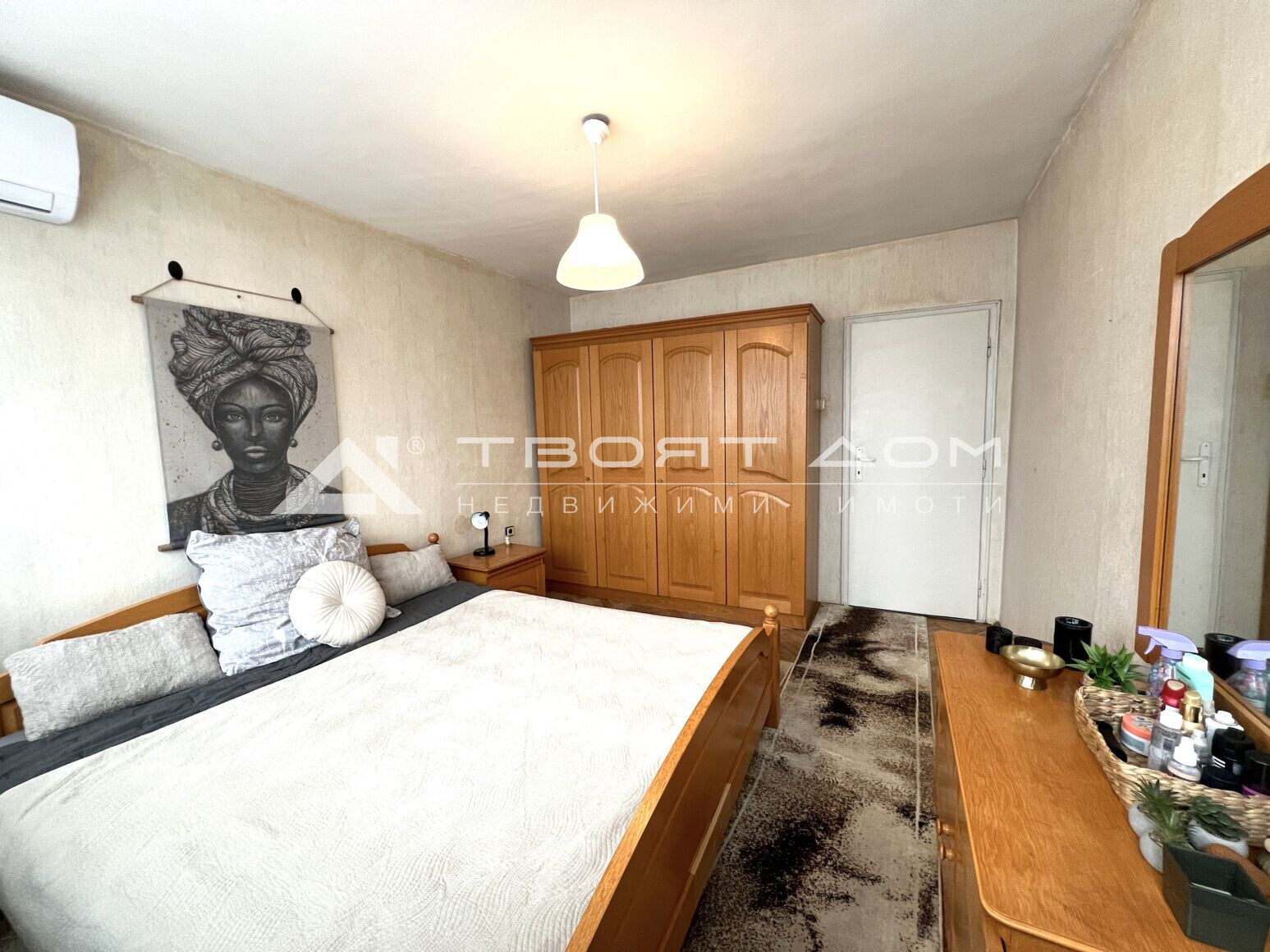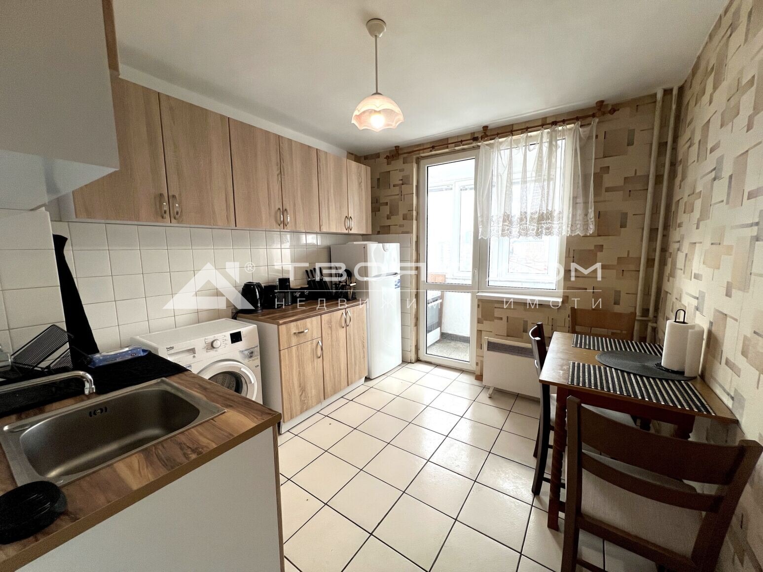 Агенция за недвижими имоти Твоят Дом предлага под наем двустаен обзаведен апартамент с площ от 75 кв. м в кв. Сердика. Жилището разполага с антре с вграден гардероб, хол обзаведен с мека мебел и излаз на балкон. Спалня с легло, гардероб и скрин, отделна кухня с нови кухненски шкафове, пералня и остъклен балкон с готварска печка и сушилня за дрехи. Отделно има килер с рафтове за съхранение. Отоплението е на ток с климатици. Апартамента е с изцяло южно изложение, което го прави много светъл и топъл. Ситуиран на дванадесети етаж в петнадесет етажен блок, строителство ЕПК. Блока разполага с два работещи асансьора, паркирането в района е свободно. В близост има спирки на градският транспорт трамвай, метро и магазини за хранителни стоки от големи вериги.