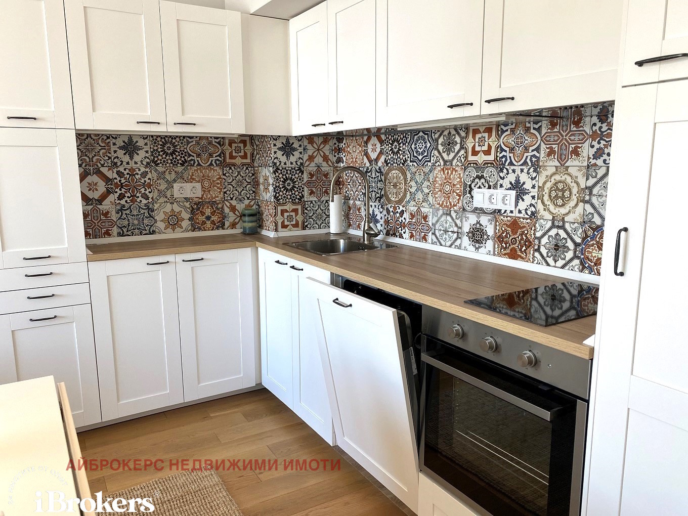 Кухненската част е напълно оборудвана с всички необходими електроуреди - хладилник, фурна, котлони, съдомиялна машина.