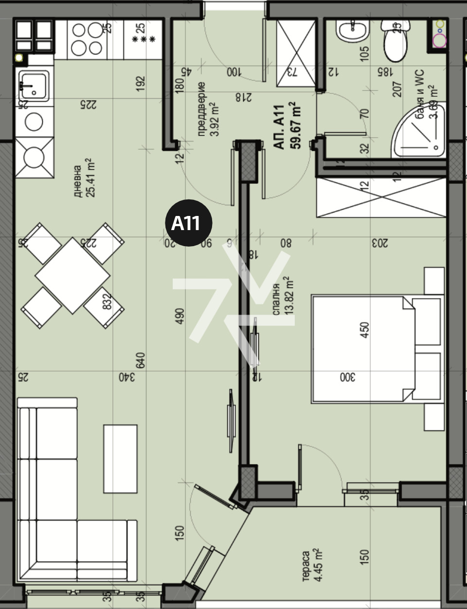 Апартаментът е идеален за млади семейства, тъй като размерите на отделните стаи са средни към големи за двустайно жилище (дневна над 25 кв.м и спалня около 14 кв.м). Имотът е изключително светъл заради големите си френски прозорци.