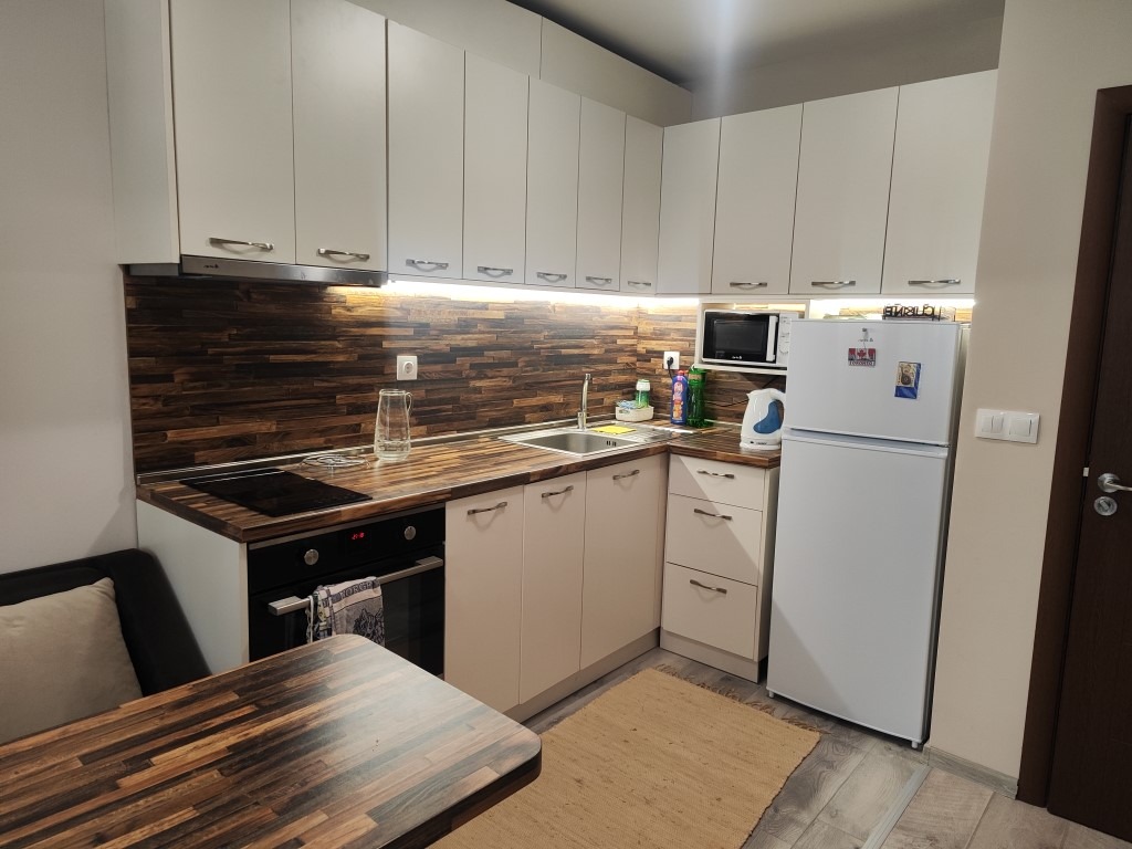 📷 Кухнята е напълно оборудвана с фурна, котлони, микровълнова, пералня и голям хладилник - всичко нужно за едно удобно и пълноценно ежедневие.