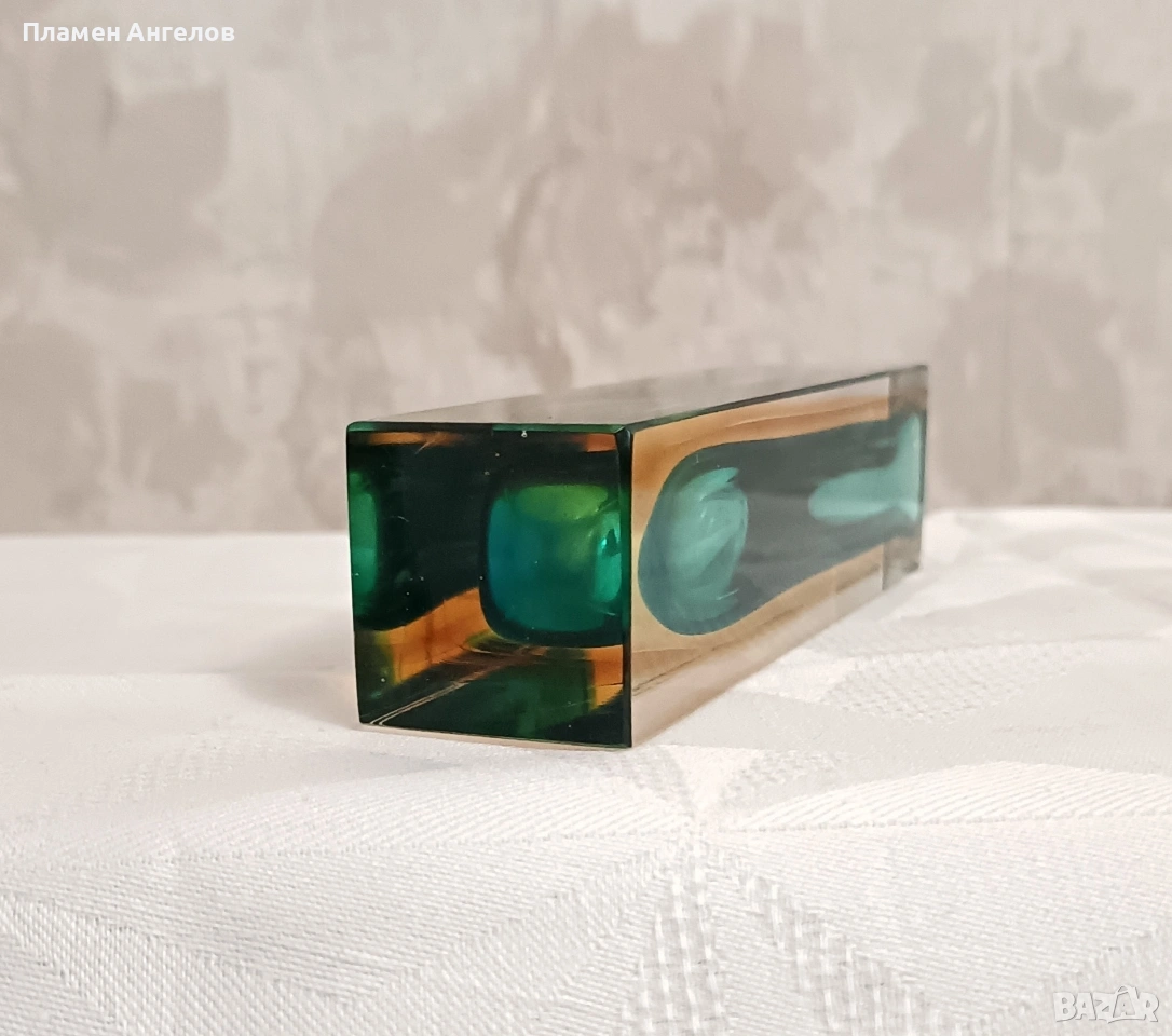 Дизайн-Флавио Поли. Стил "Mid-Century Modern" 50те-60те години. Изящна ваза от истенско Мурано стъкло. Изработена по класическа техника "Sommerso" - потопено стъкло. Вазата съчетава два наситени цвята кеклибарена, златиста външна част и дълбоко изумрудено зелено ядро в прозрачен, висококачествен кристал. Вазата е отлично запазена. Висока 14см.Цената е твърда, без коментар.