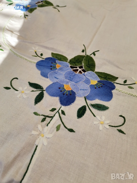 Разкошна покривка за маса с флорални мотиви от рязана цветна бродерия, материя памук, размери 170х120см. Отлично състояние.
