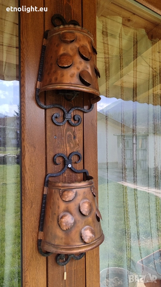 цената е за комплекта два броя,, красиви стенни лампи съчетание от ковано желязо и метални капаци в меден цвят, фасунгите са Е 27 стандартни, височина 35 см