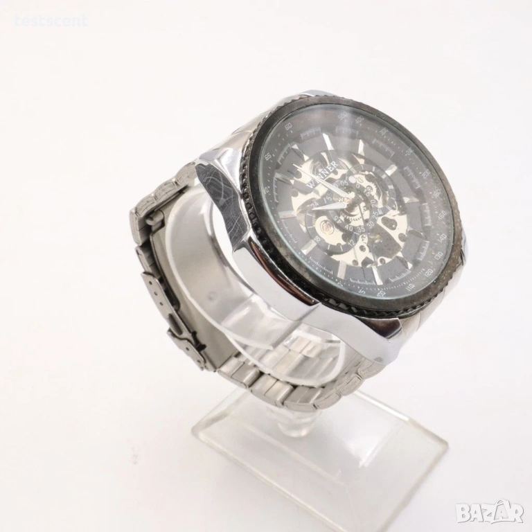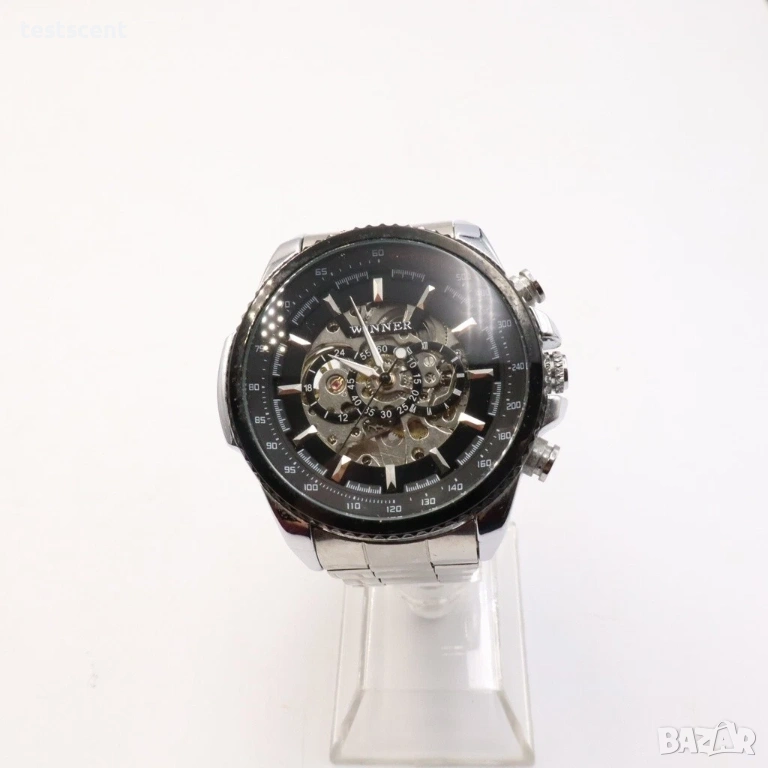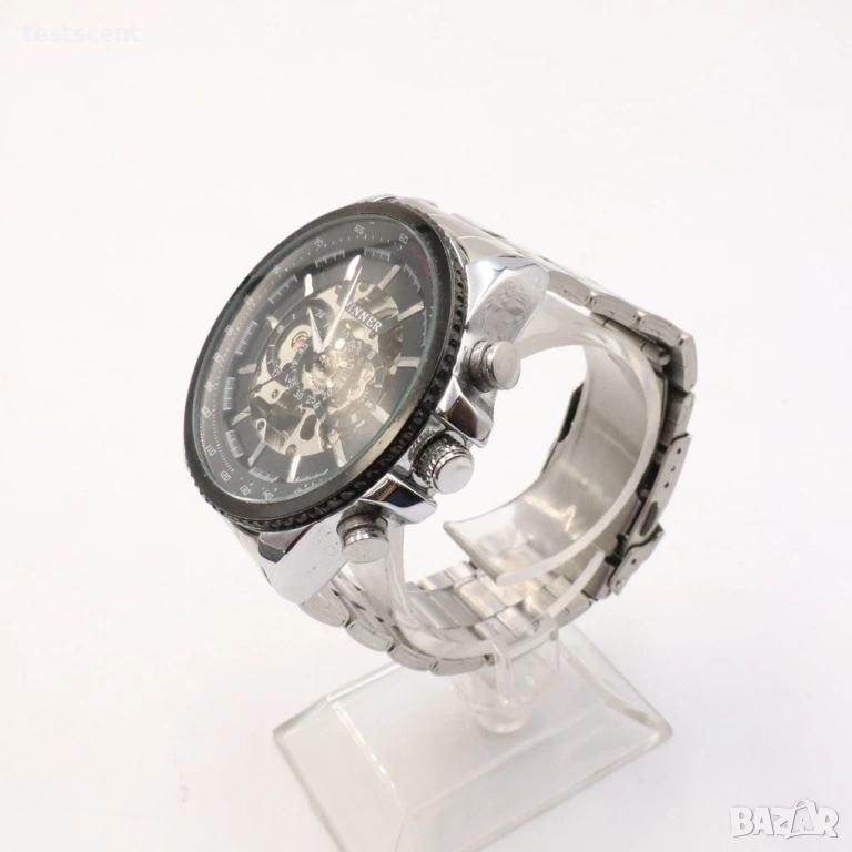 Продавам мъжки часовник Winner Skeleton Automatic с ефектен черен skeleton циферблат и метална верижка от неръждаема стомана. Моделът е с автоматичен механичен механизъм и масивна визия, подходящ за ежедневно носене или колекция.