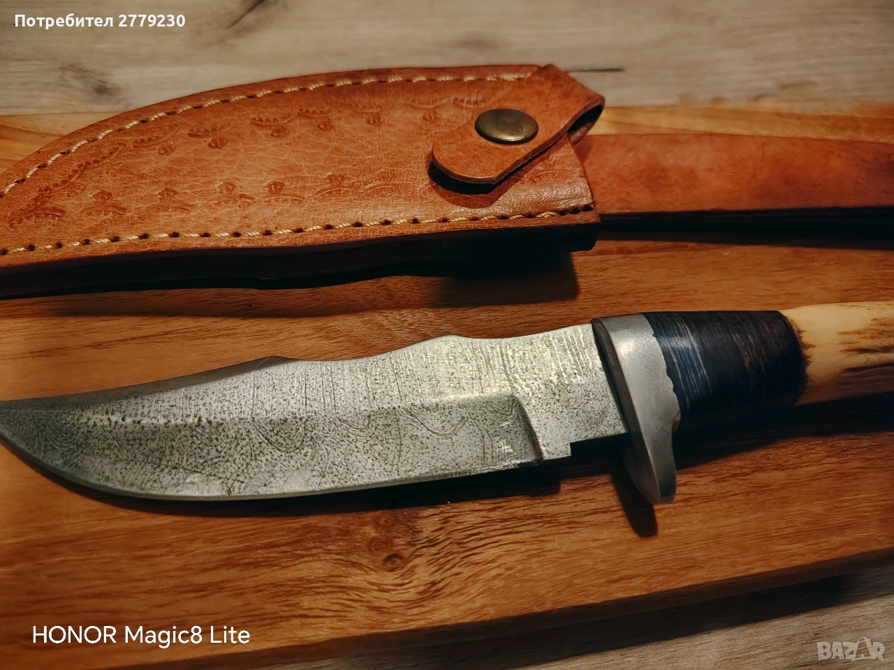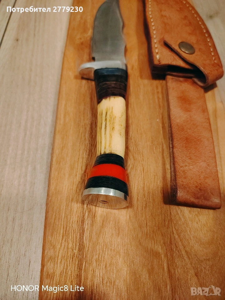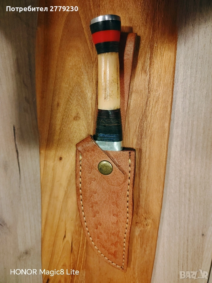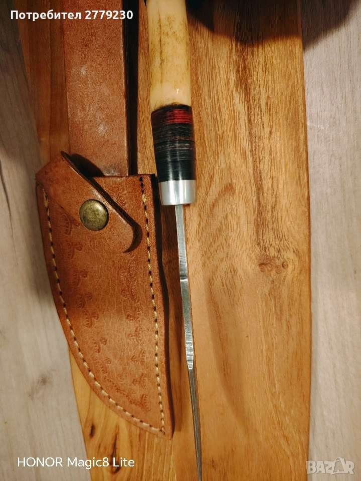 Нож от дамаска стомана. Дръжката е от кост. С кожена кания. С преглед пред заплащане. Погледнете и другите ми обяви на интереси ножове.
