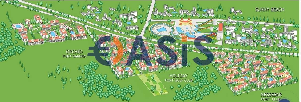 Комплексът разполага с голяма, обособена и защитена територия с видеонаблюдение, включващо всичко необходимо за почивка: 4 басейна, фитнес площадки, детски площадки, ресторанти, магазини.