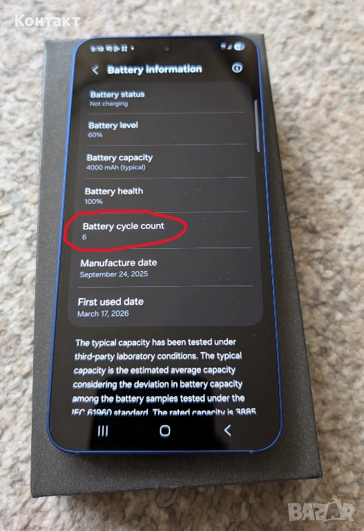Samsung Galaxy S25, 256GB. Телефонът е неотличим от нов и е на 6 цикъла на батерията. Пълен комплект без гаранция.