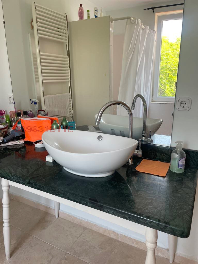 Банята има душ-кабина и вана, умивалника е монтиран на голям зелен мраморен плот.