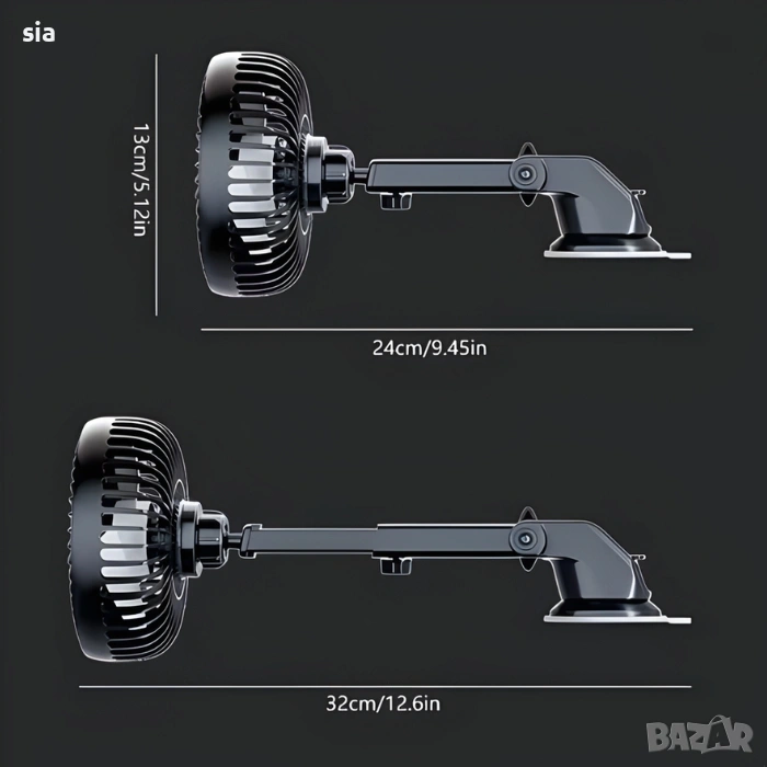 Вентилаторът е оборудван с вакуумна стойка, която позволява стабилно закрепване към таблото или стъклото на автомобила. Благодарение на регулируемото рамо и въртящата се глава на 360°, можете лесно да насочите въздушния поток във всяка желана посока за максимален комфорт на водача или пътниците.