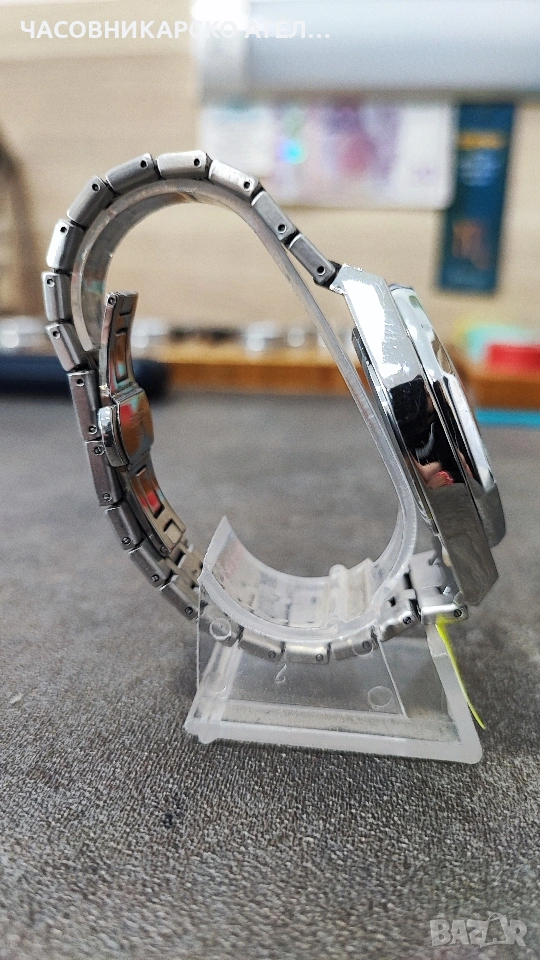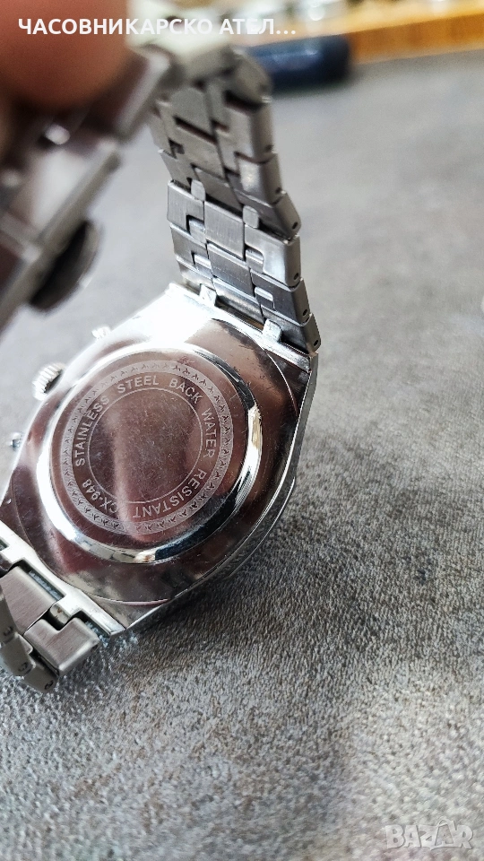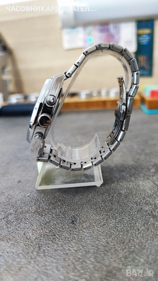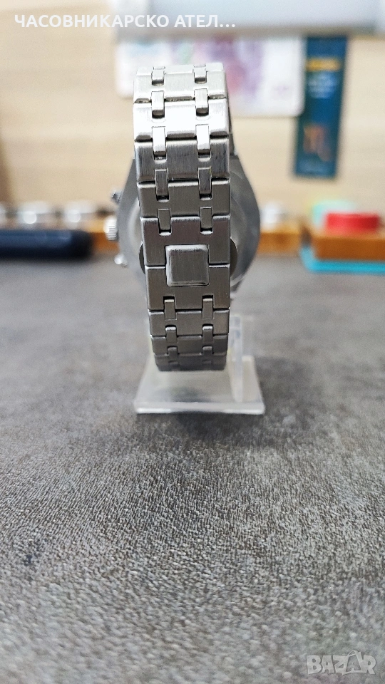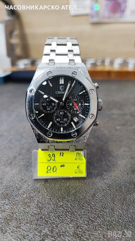 Мъжки часовник Chenxi Chronograph Това е кварцов часовник със стилен дизайн, вдъхновен от класическите луксозни спортни модели с осмоъгълен безел. Основни характеристики Механизъм: Кварцов. Материали: Верижка от неръждаема стомана със закопчалка тип пеперуда. Функции: Хронограф (секундарник, минути), 24-часов формат, дата и луминисцентни стрелки. Размери: Диаметър на циферблата около 42 mm и дебелина 14 mm. Стъкло: Минерално стъкло (Hardlex) за по-добра устойчивост на надраскване. Като нов слагам броени пъти. Нова японска дълготрайна батерия.