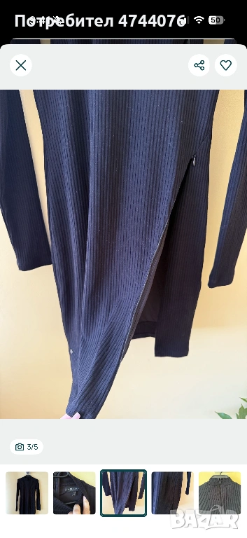 Елегантна рокля по тялото на марката Guess. Материалът е плътно трико. Закопчава се с цип на гърба, като също има цепка с цип отпред. Размер S.