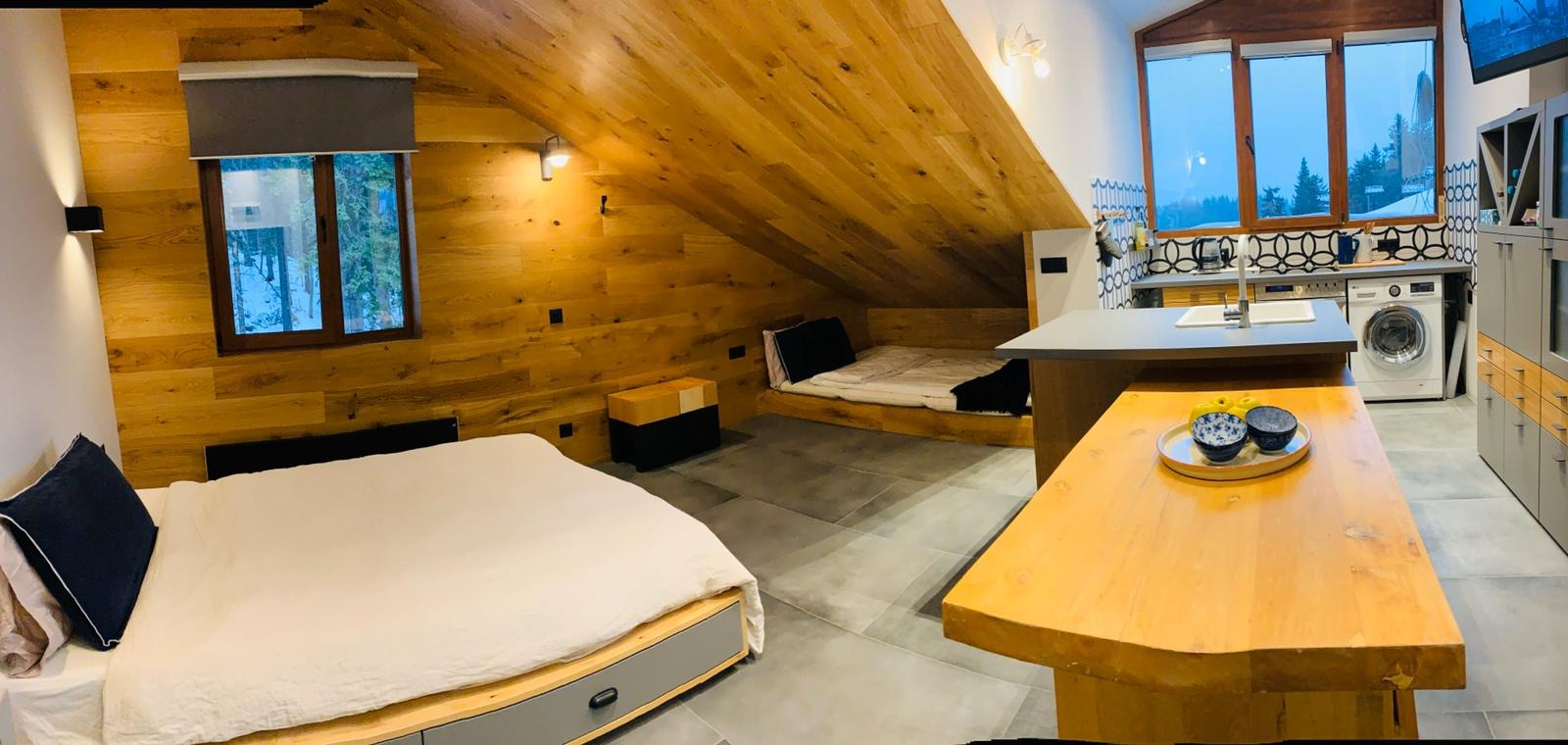 Апартаментите съчетават уютна атмосфера, модерен интериорен дизайн и панорамна гледка към Родопите.