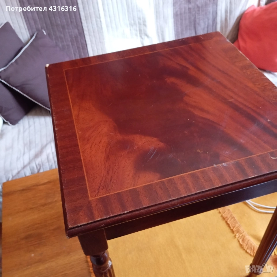 Прекрасна махагонова масичка. размери: висока 50 см. плот 40 / 40 см. Има леки поправими забележки по плота.