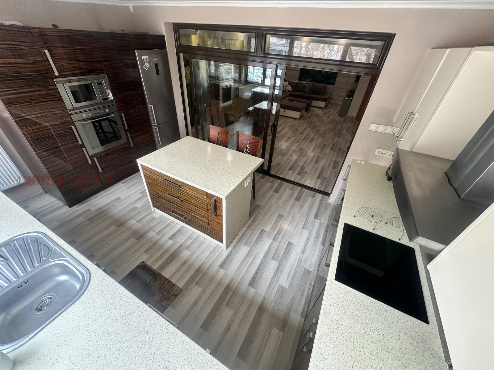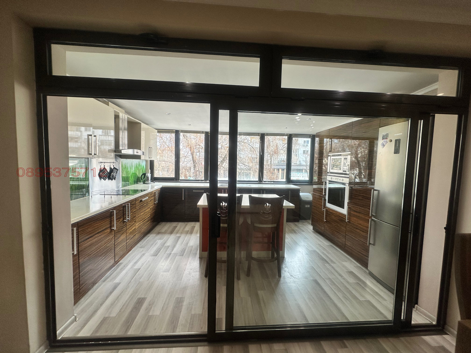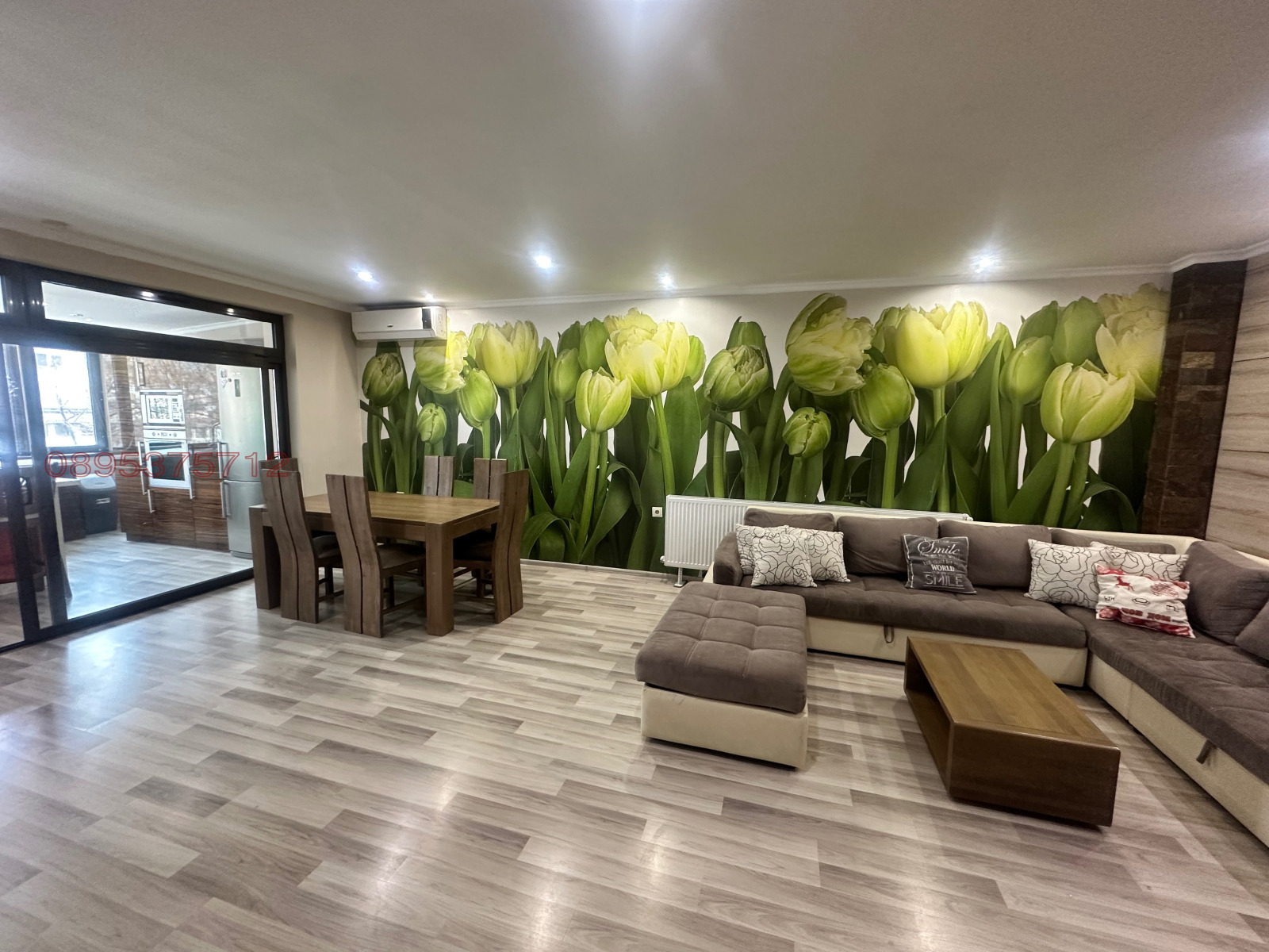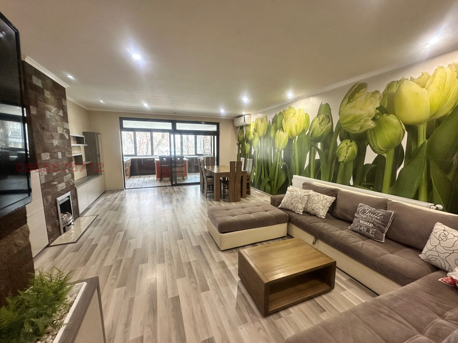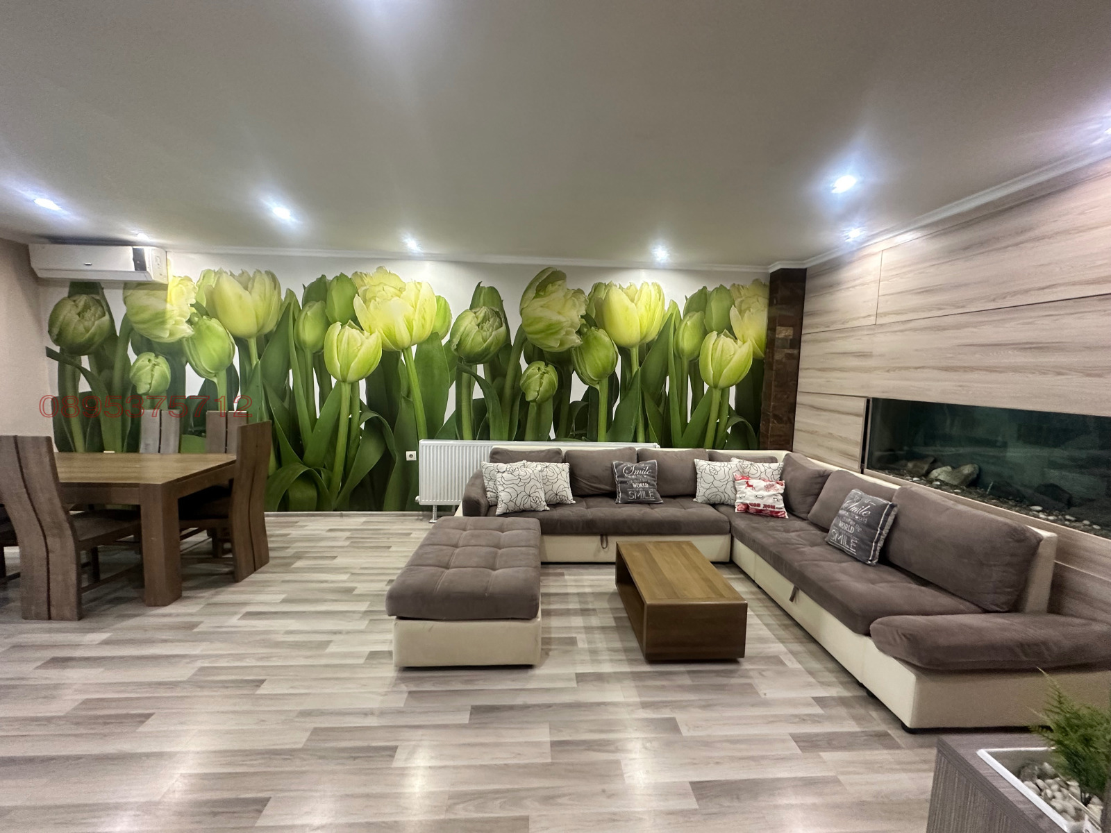 Отдавам луксозен тристаен апартамент, широк център.120 кв.м +30 кв.м тераса към него.Апартамента е напълно обзаведен. Кухнята е отделена с плъзгаща врата и е напълно оборудвана с вградени мебели: съдомиялна, сушилня, пералня, микровълнова, фурна и печка bosh.хола е с ъглов диван и трапезна маса за шест човека от естествено дърво има аквариум с стената 300 л. И газова камина. Спалнята е с двойно легло матрак Тед Суприно. Огромен гардероб с плъзгащи врати, две нощни шкафчета,скрин и тоалетка с огледало и шкафчета и с излак към тераса.Детската стая е пригодена за две деца с двуетажно легло две бюра и два шкафа със скрин и ракла и с излак към терасата. Баня с душ кабина мивка със шкафове и тоалетна. Отделно още една тоалетна с мивка и шкафове. Голям коридор с портманто и гардероб с плъзгащи врати с огледала. Първи етаж не партер. Наем 450 . При наемане депозит от 2м. Апартамента е на газ има и климатик. Постоянно топла вода от газов бойлер.Отделно се предлага и двоен гараж за две коли 150